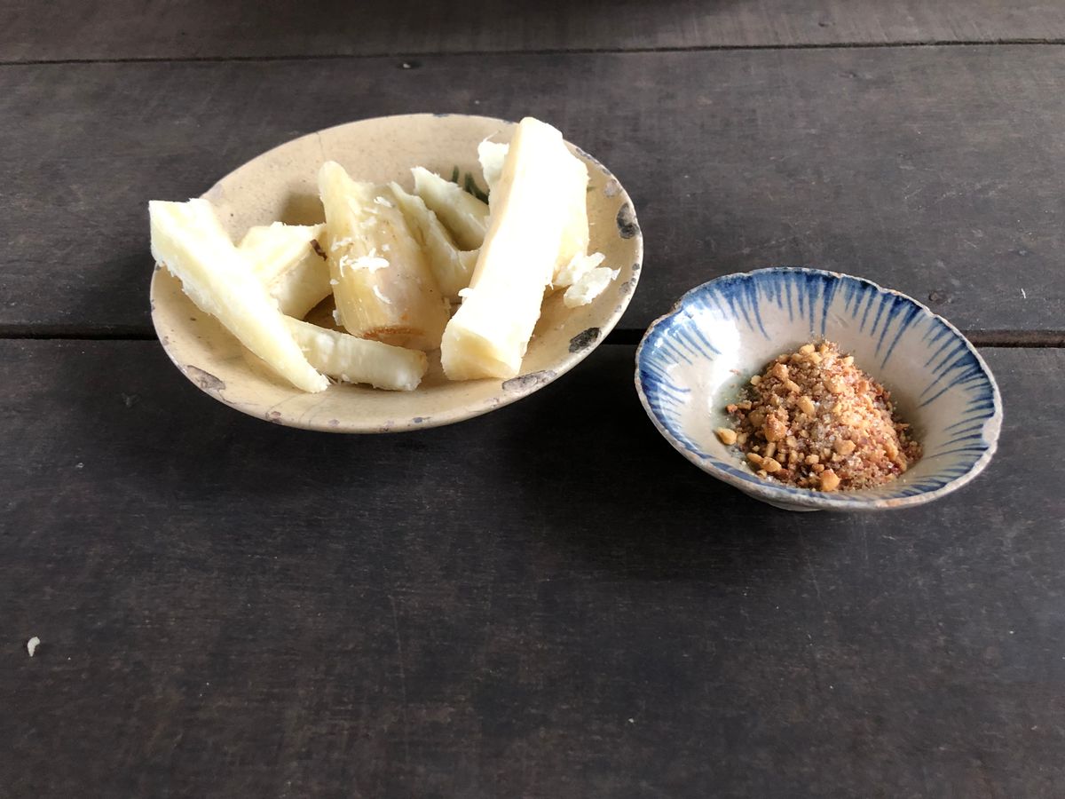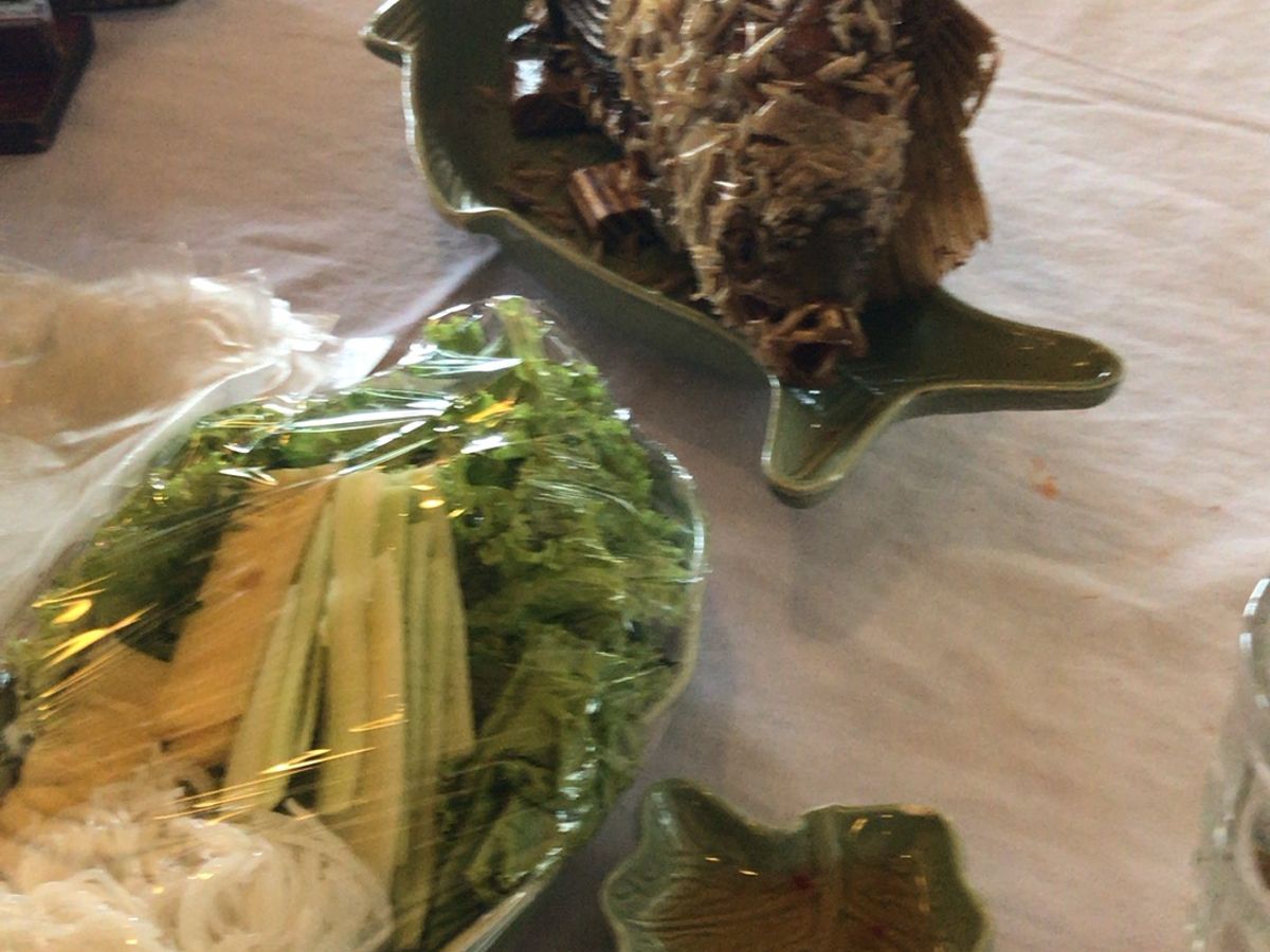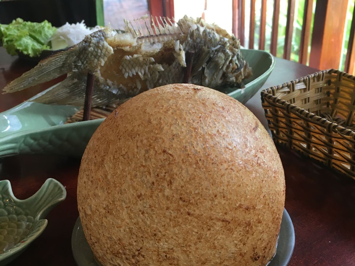 今回は見学で時間が押していたため、途中14時過ぎの昼食です。オシャレなレストランで名物の象耳魚の生春巻き、真ん丸の揚げ餅など地元料理を美味しくいただきました。