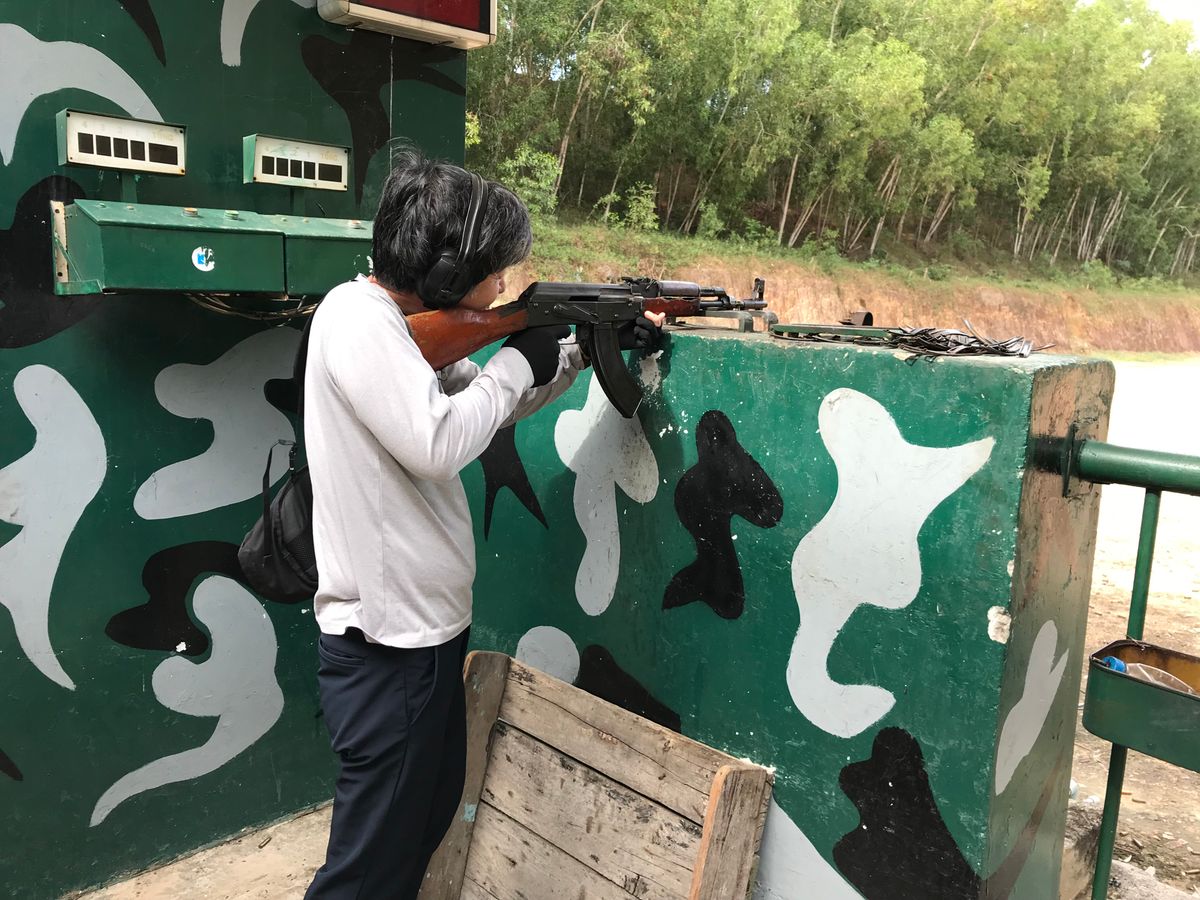 ピックアップの時間が過ぎたが、なかなかホテルに送迎車が来ない。20分程して催行会社の日本人が来られて、大型バスなので、歩きで5分程の場所へ案内された。ここで、約30数人のツアーと分かりました。現地ガイドさんの話を聞き、1時間半掛けてクチトンネルへ移動、軍管理の射撃場で3人降りました。(その間、射撃しない人はバスに待機してもらい申し訳なかった。)銃は、数種類あるが、初めての射撃なので小柄なAK47で行いました。銃自体は、銃座に固定されるので重さと反動は、思ったより小さい。60万ドン(約3千円)で10発ですが、十分満足しました。スマホをガイドさんに渡し動画も取ってもらいました。バスに乗り込み、トンネル入口へ、まず、当時の米軍の戦車、航空機他の実物展示が見えました。パネルでガイドの説明を受け、ホーチミン中心から、この地はどの位置なのか、75kmぐらいの距離、米軍が使った枯葉剤、大量の爆弾で徹底的に攻撃を受けたのだが、地下で暮らせるトンネルを長距離、数層に深く掘ったということがわかった。トンネルの狭さ、暗さにびっくり、米軍兵士からすると、体格的に中に入ること自体難しく、内部でも落とし穴があるという地下要塞に恐れをなした、と思いました。中の居室は、灯りもあるが、こうもりもいました。トンネルは、結構狭いので、しゃがみこんで膝と腰を痛めます。(帰国後も、まだ痛い。)