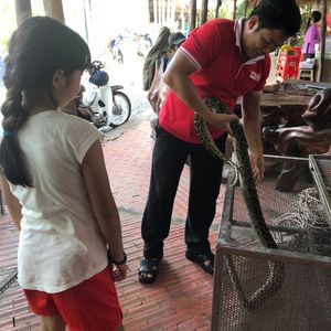 その後は巨大な蛇を首にまかせてもらいました。蛇はひんやりしていて迫力満点です!