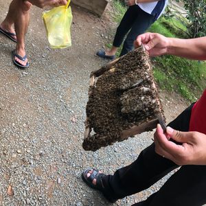 蜂のたくさんついた蜂の巣を持たせてもらい、そのまま指を入れて出来たての蜂蜜を試食。