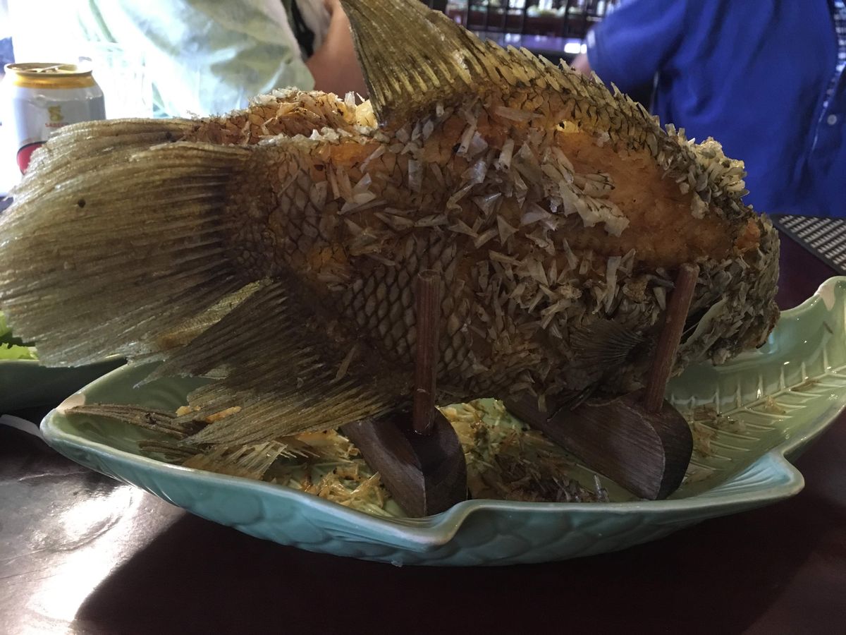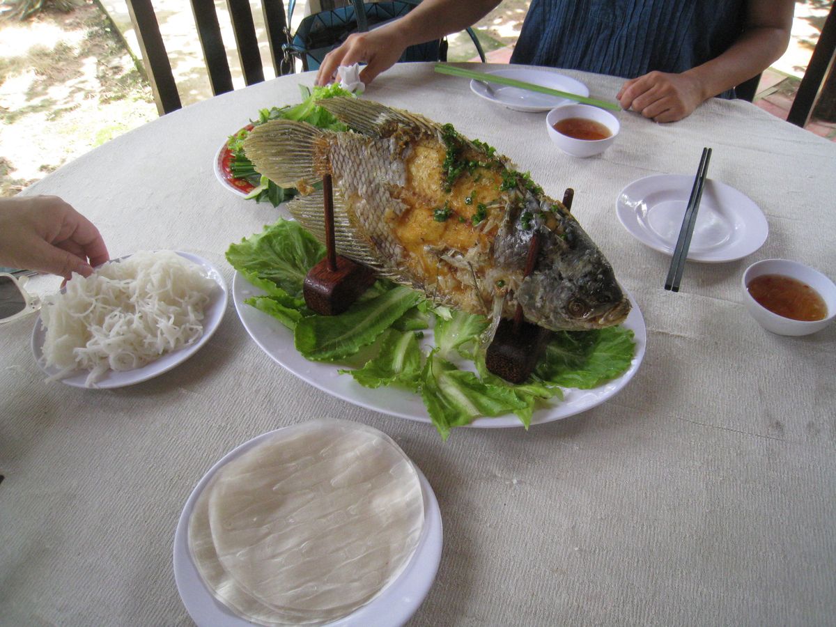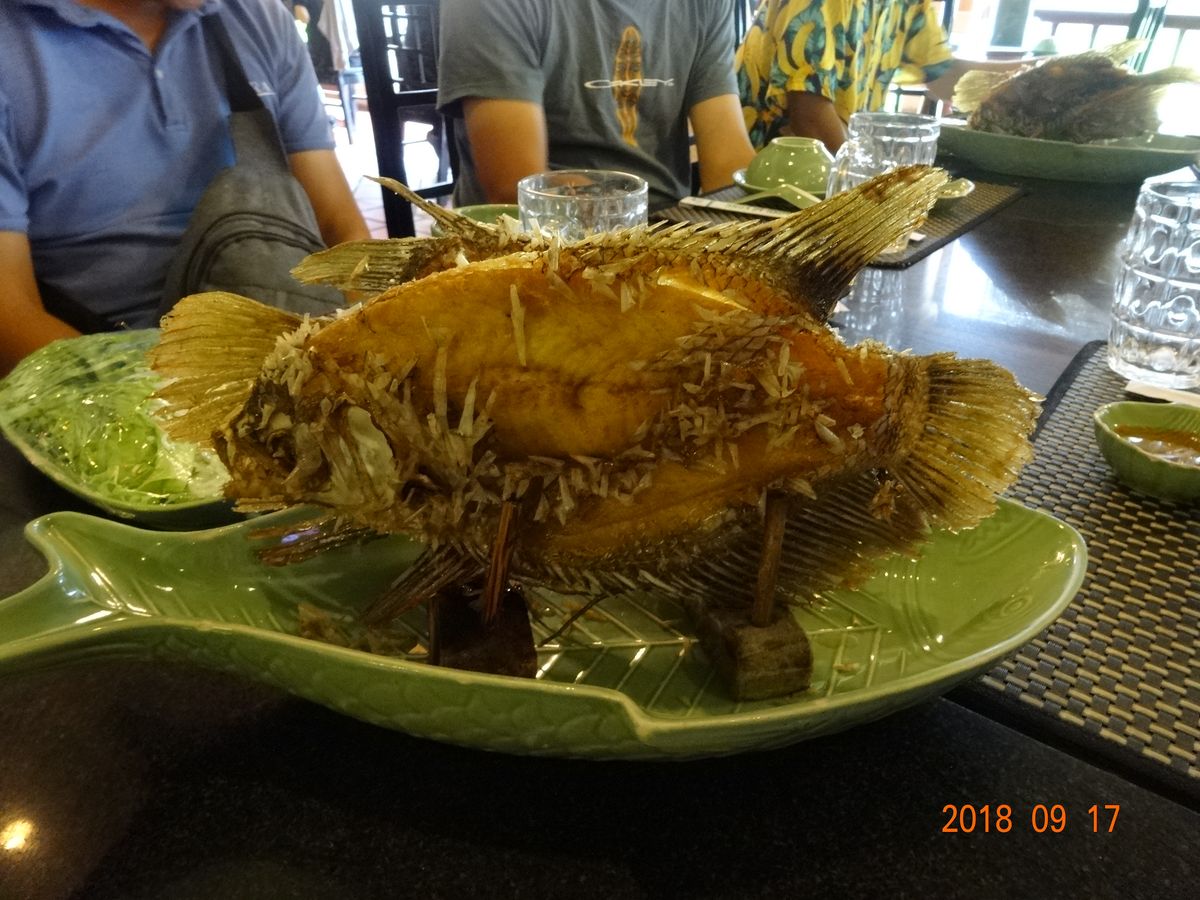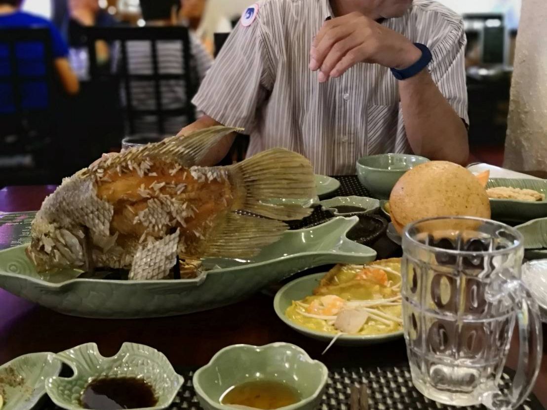 昼食は、頑張って皇太子のメニューにしました!食べきれないほどの皿数と量でした。フォーがとっても美味しかったです。象耳魚も白身であっさりして美味しかったです。南国の雰囲気満点のレストランでした。