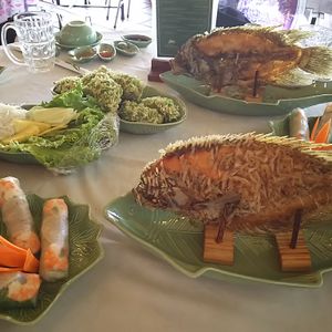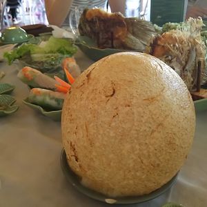 その後は、メコン川の近くのレストランでベトナム料理のランチを美味しくいただきました。像耳魚の焼き魚、生春巻きカエルの串焼き、お好み焼き、揚げ春巻き、揚げ餅、フォーとどれもグットでした。飲み物にココナッツジュースを注文しました。自然の味でよかったです。お餅を20cmほどの球状に揚げたものは、目を楽しませてくれました。