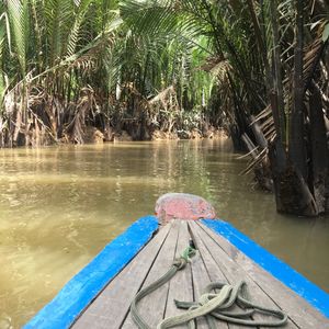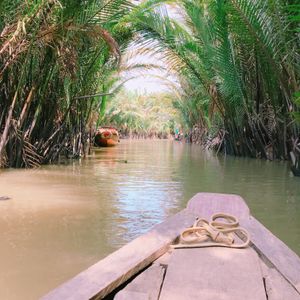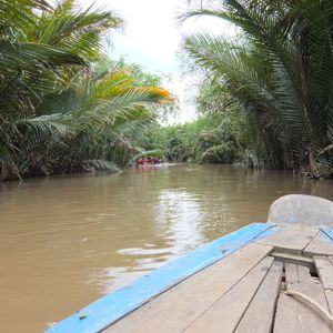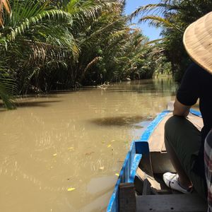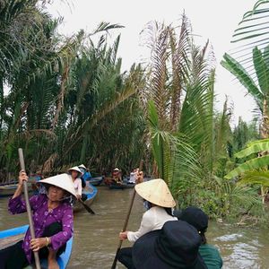 ユニコーン島をガイドさんと散策して、ハチミツ、ヘビ、ココナッツキャンディ、フルーツ、不思議な演奏、、と充実の内容のあと、クライマックスの手漕ぎボート!ベトナムの帽子?笠を貸してくれて20分くらいの川くだり。担当してくれた船頭さんがスゴいパワフルでどの船よりもスピードを出して進んで、どんどん前の船を抜いていったので楽しかったです!