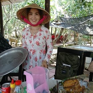担当の現地ガイドさんがとても面白く、日本語もお上手なので、ミトーまであっと言う間に到着し、その後ボートで離島へ行きました。蜂蜜農家でハチミツティー、ココナッツキャンディー工房で出来たてのキャンディー、果樹園でトロピカルフルーツの試食など、ランチまでにいろいろ試食を頂きましたので、結構お腹いっぱいになりました。蜂蜜農家で大きな蛇がいたのですが、蛇を首に巻きつけたのは人生初だったので、怖かったけれどいい思い出になりました。デルタクルーズでは一人一人にノンラーを貸していただけて、ベトナムっぽいな〜と楽しかったです!ランチの魚は皮?がパリパリしていて、お店の方がライスペーパーで巻いてくれました。丸い揚げ餅がとても美味しかったです!