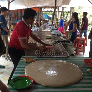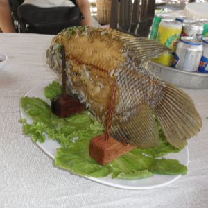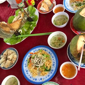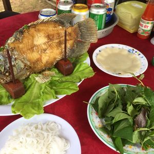 エレファントフィッシュという鱗付きの魚の丸揚げがメインのランチです。風船のような揚げ餅や春巻、ブン麺など食べきれないくらいの品数が出ました。どれも本当に美味しかったです‼︎