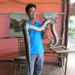 参加者は日本人の方のみで、1〜3人の7グループでした。ミトーに向かう前に中華街の寺に立ち寄り、その後ミトーにて蜂蜜農家、ココナッツキャラメル工場、最後に様々なフルーツを食べ、メコン川クルーズという流れ。蜂蜜農家では蛇と記念撮影、蜂蜜やローヤルゼリーを購入しました。少しバス移動しレストランへ。有名なエレファントフィッシュの春巻きなどをビールとともにいただきました。