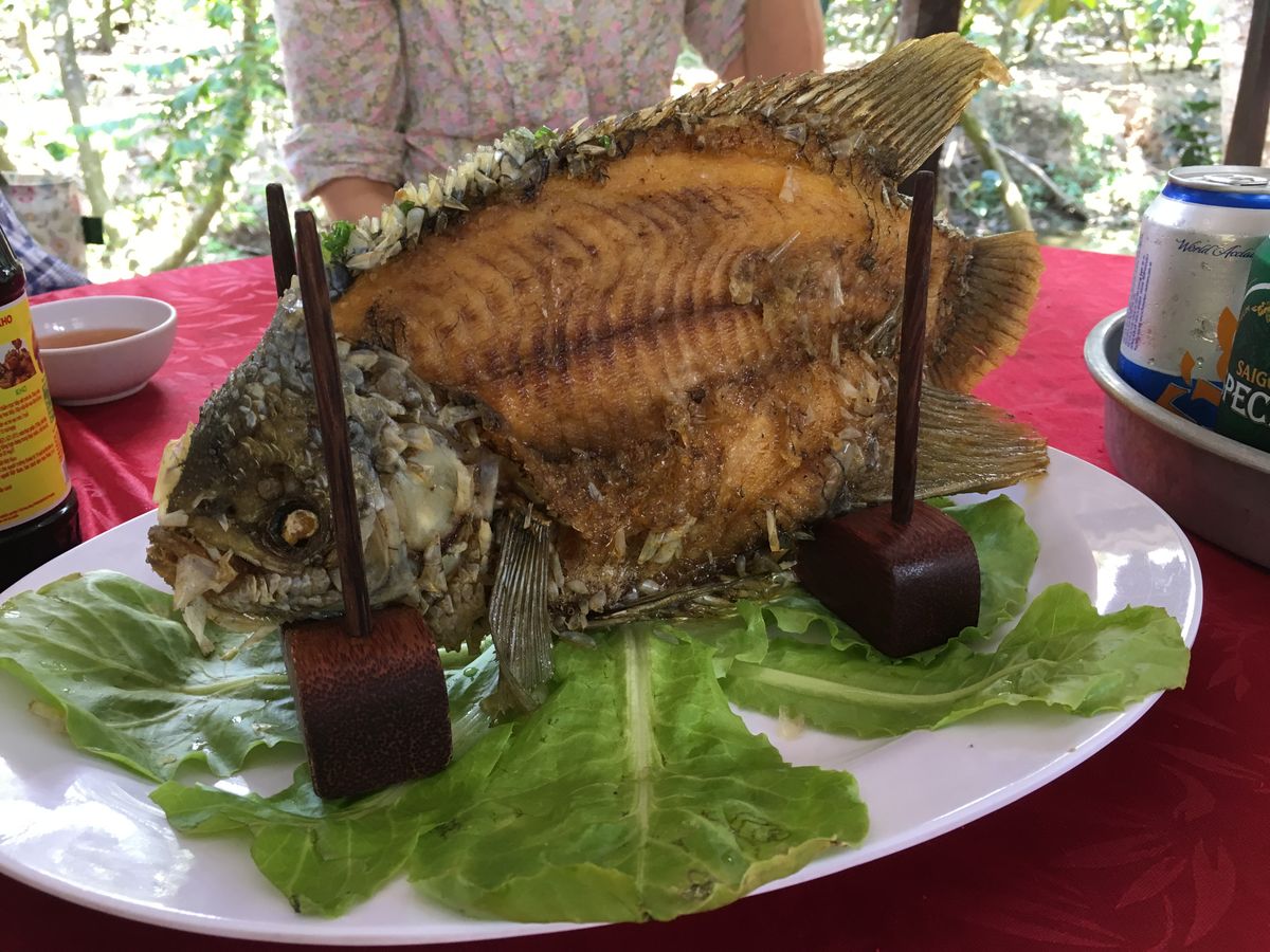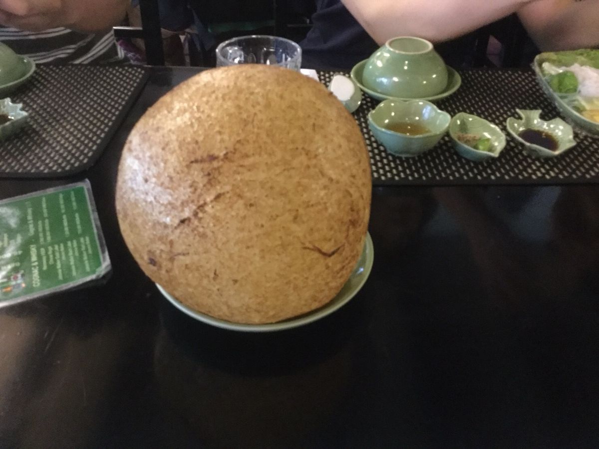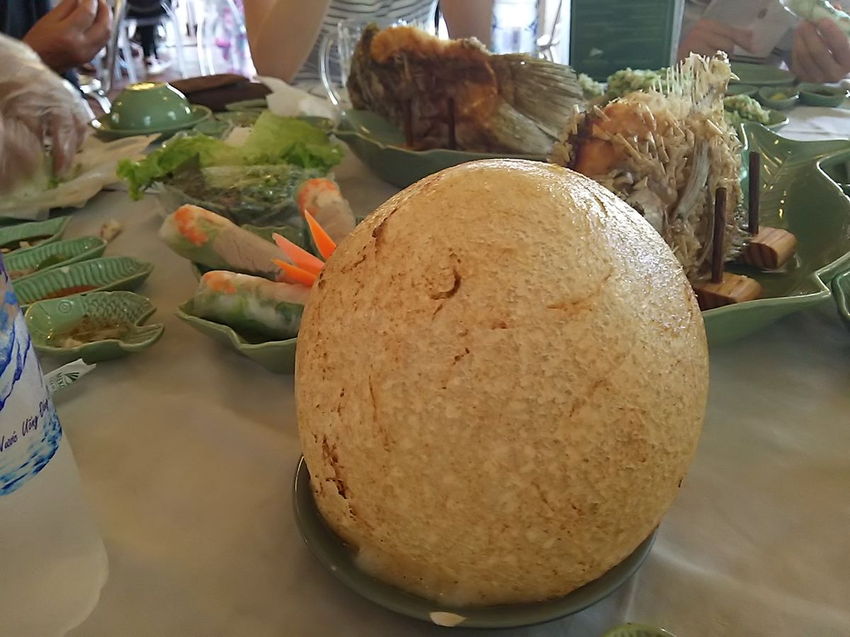 その後は、メコン川の近くのレストランでベトナム料理のランチを美味しくいただきました。像耳魚の焼き魚、生春巻きカエルの串焼き、お好み焼き、揚げ春巻き、揚げ餅、フォーとどれもグットでした。飲み物にココナッツジュースを注文しました。自然の味でよかったです。お餅を20cmほどの球状に揚げたものは、目を楽しませてくれました。