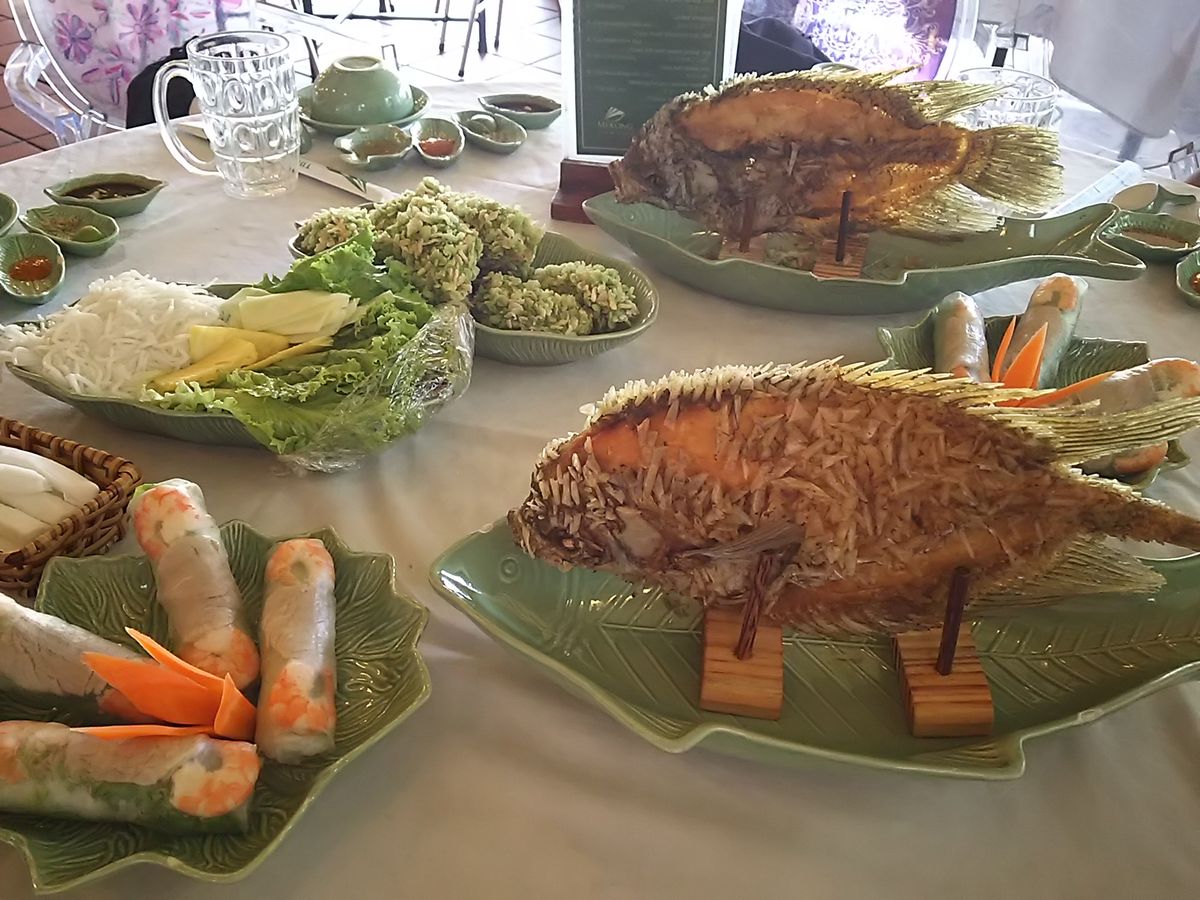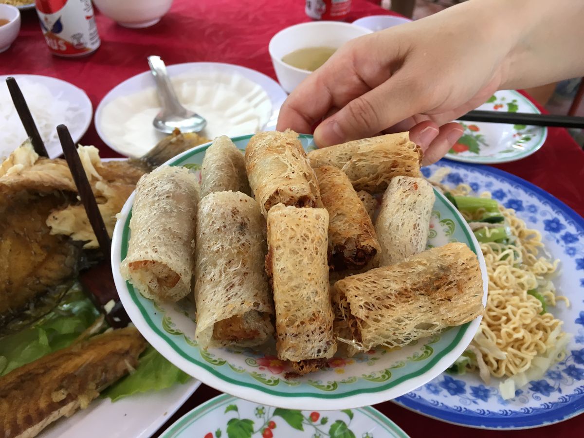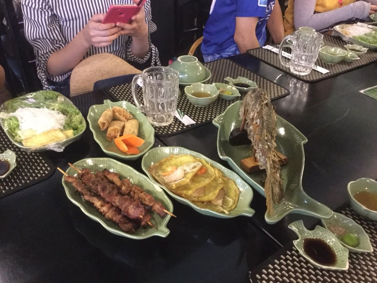 その後は、メコン川の近くのレストランでベトナム料理のランチを美味しくいただきました。像耳魚の焼き魚、生春巻きカエルの串焼き、お好み焼き、揚げ春巻き、揚げ餅、フォーとどれもグットでした。飲み物にココナッツジュースを注文しました。自然の味でよかったです。お餅を20cmほどの球状に揚げたものは、目を楽しませてくれました。