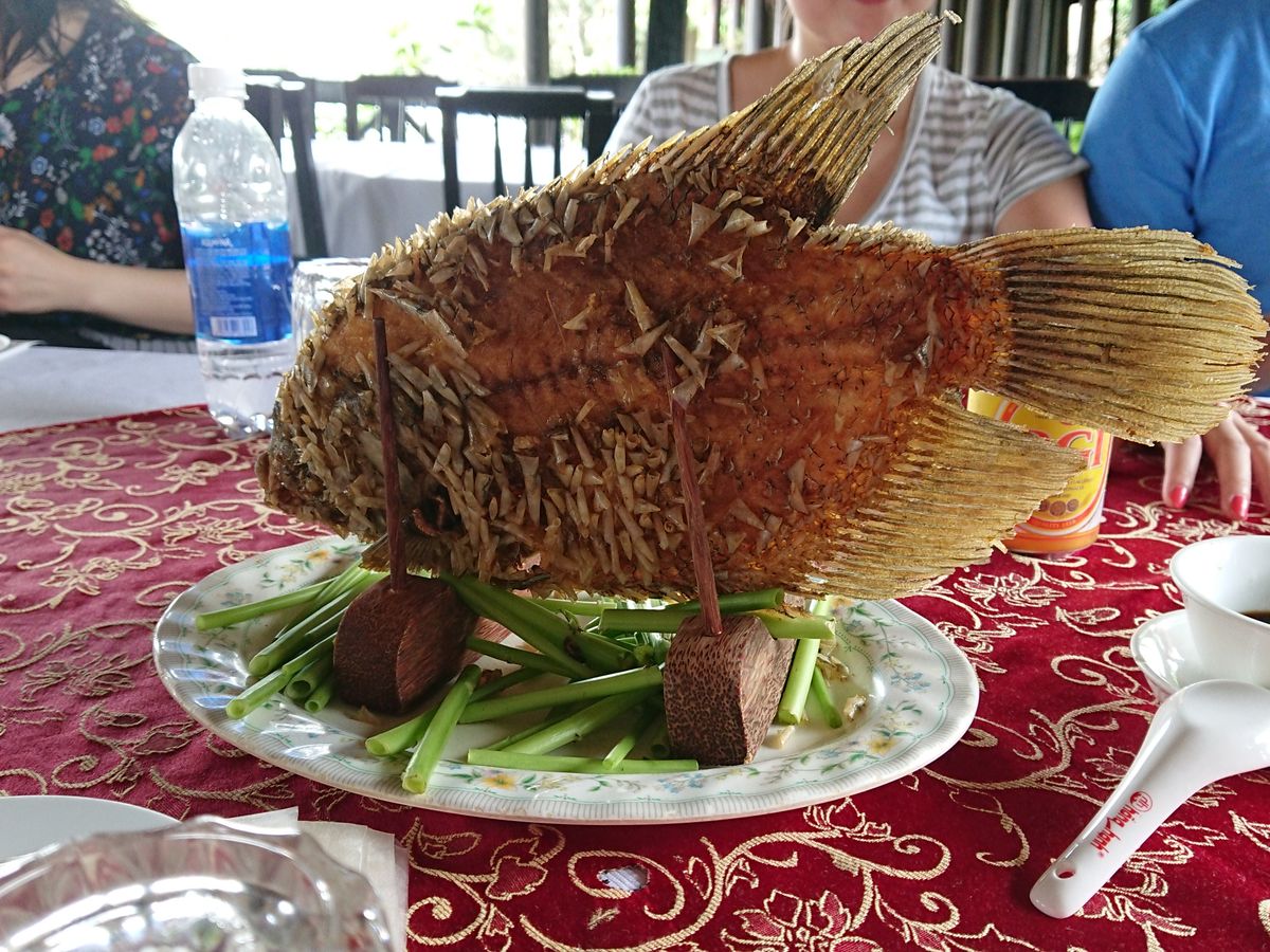メコン川クルーズは、ボートに乗っていくので、メコン川が身近に感じられました。昼食にでた、やきそば?らしきものは、インスタントで。ちょっとがっかりでしたが、エレファントフィッシュにびっくり!