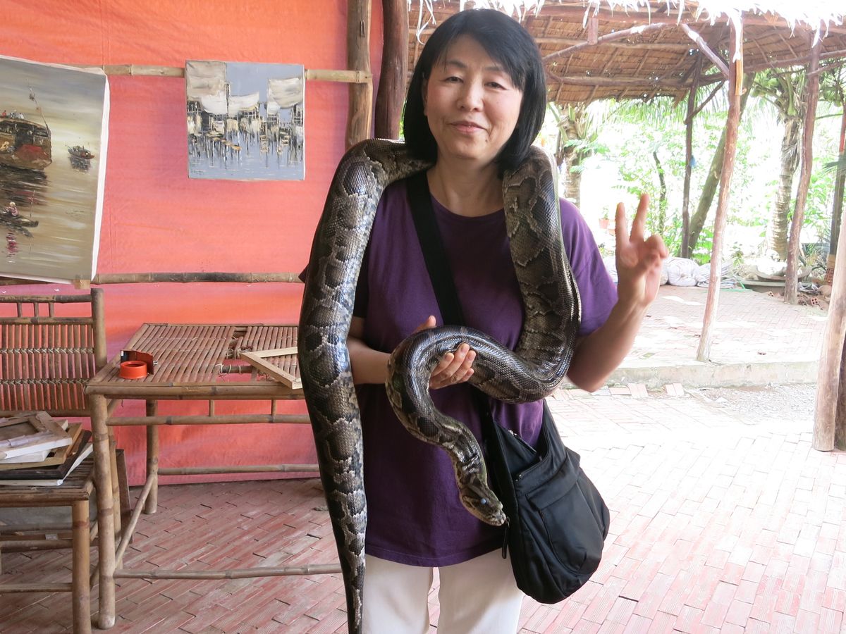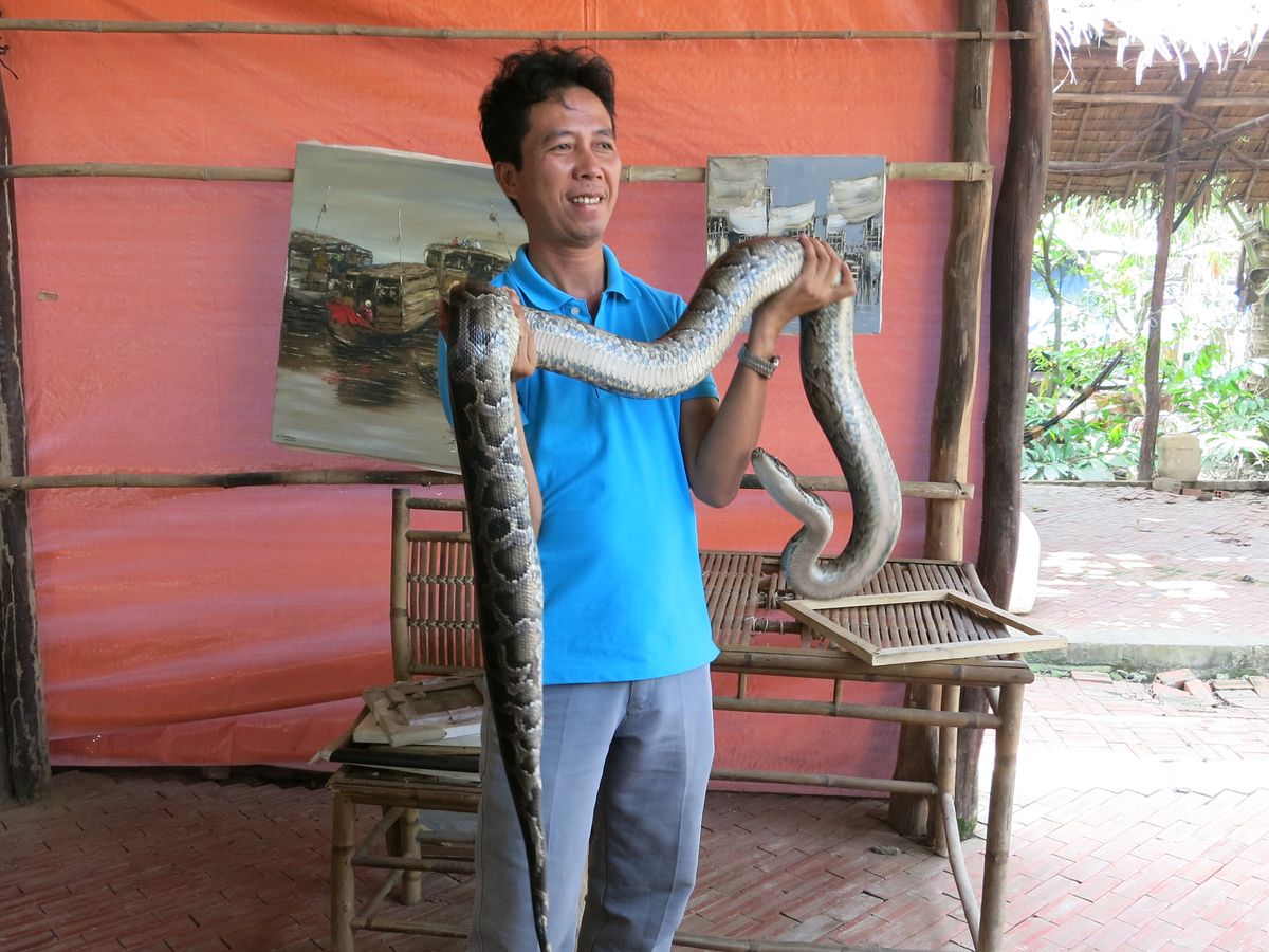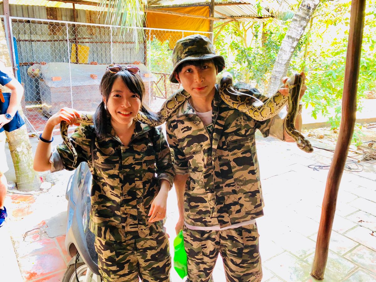 参加者は日本人の方のみで、1〜3人の7グループでした。ミトーに向かう前に中華街の寺に立ち寄り、その後ミトーにて蜂蜜農家、ココナッツキャラメル工場、最後に様々なフルーツを食べ、メコン川クルーズという流れ。蜂蜜農家では蛇と記念撮影、蜂蜜やローヤルゼリーを購入しました。少しバス移動しレストランへ。有名なエレファントフィッシュの春巻きなどをビールとともにいただきました。