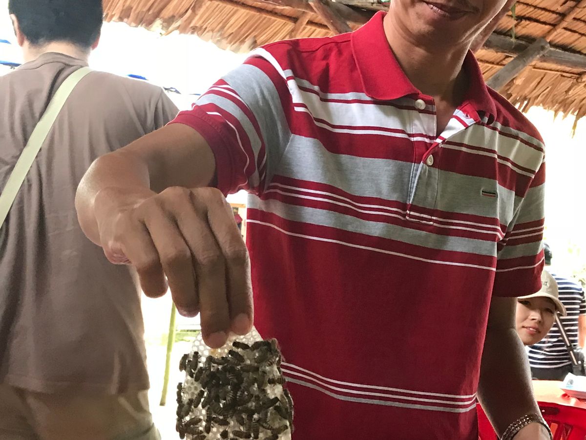 ホテルまでLuxuryなバスで迎えに来ていただき、ゆったりメコン川へ。日本語がお上手なガイドさんが最初の45分ほどベトナムについて詳しく説明してくれました。2時間ほどバス移動で、次は40人ほど乗れるボートで向こう岸へ移動。まず最初は蜂蜜農家。蜂の巣の中に指を突っ込んで蜂蜜を食べるという、普段ではできないことを体験。皆怖がってましたが、蜂蜜は美味しかった。蛇を肩に乗せると腕を舐め舐め、しっぽは足に絡んできてThrillingな体験ができました!