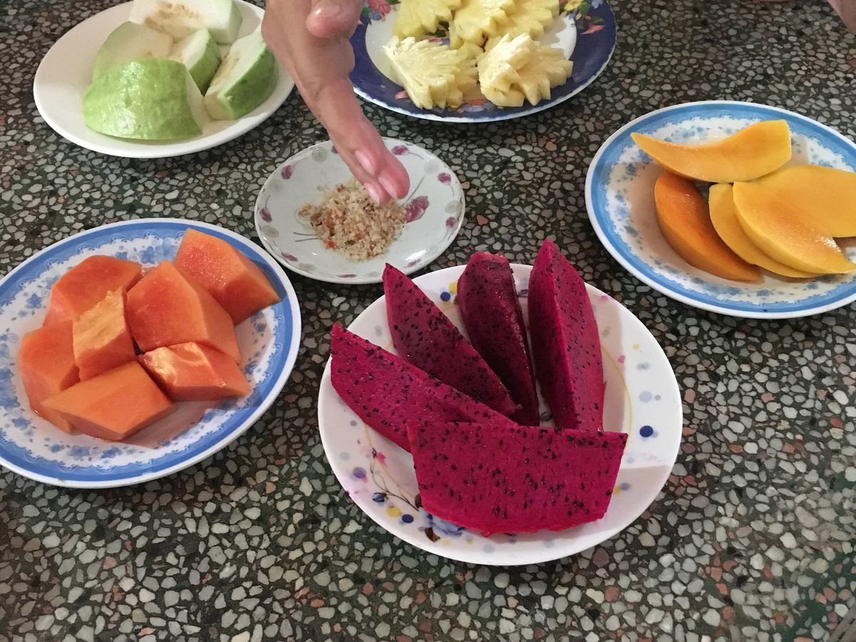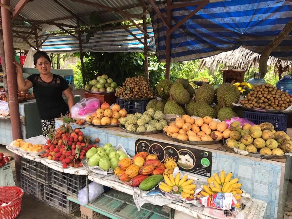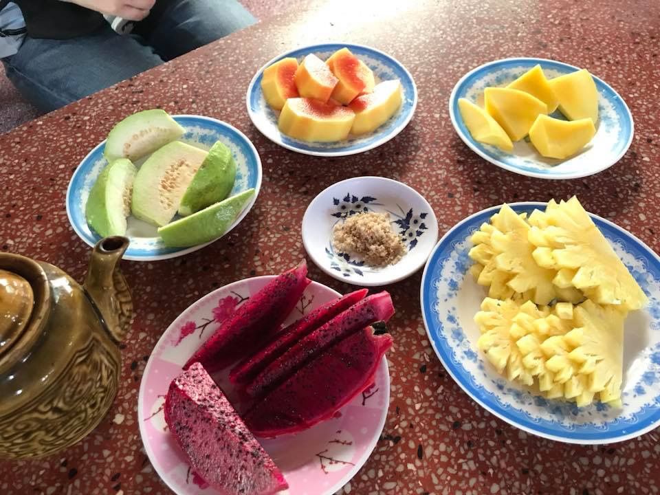 メコン川クルーズの前に歩いて島を散策しました。様々なフルーツを鑑賞でき、笹茶やベトナムフルーツ、竜眼の蜂蜜なども試食でき、希望すれば首に蛇を巻くこともできます。