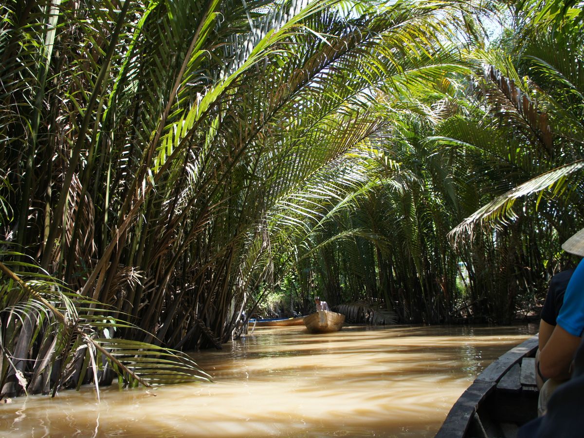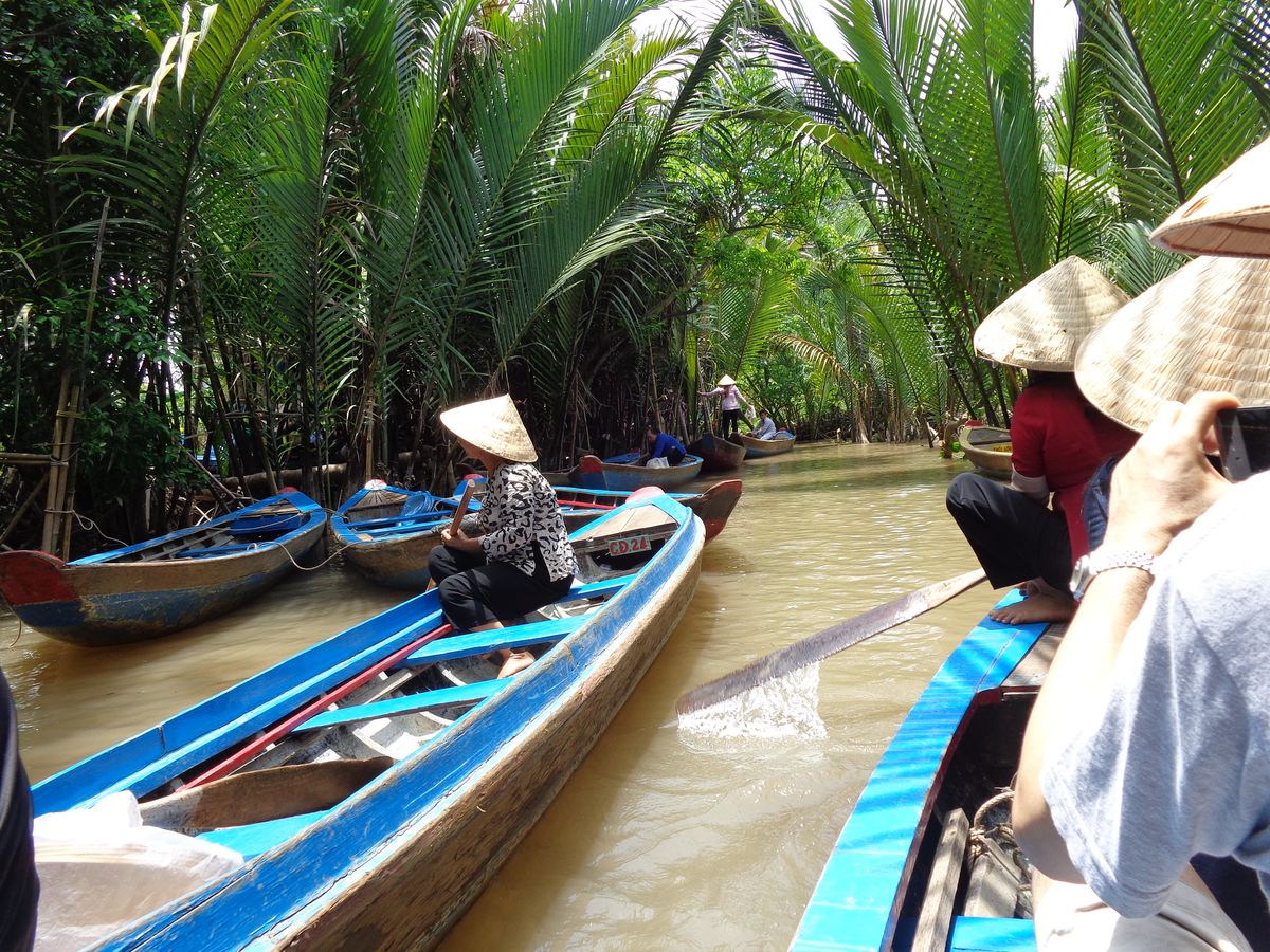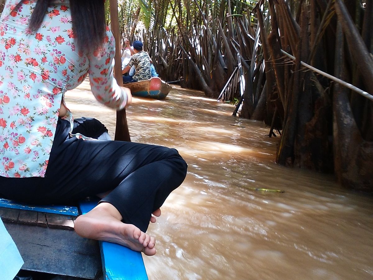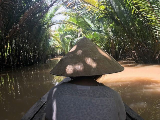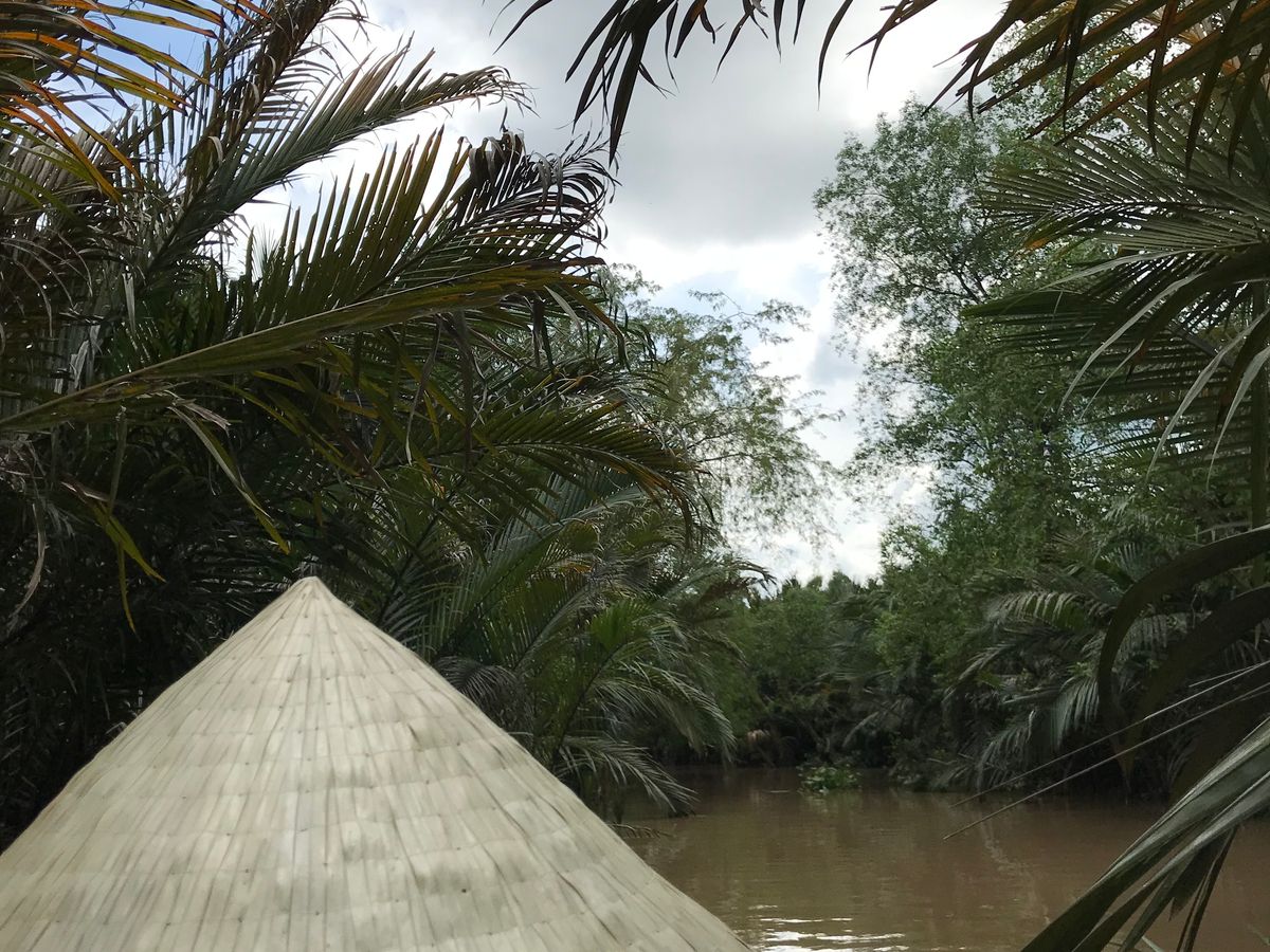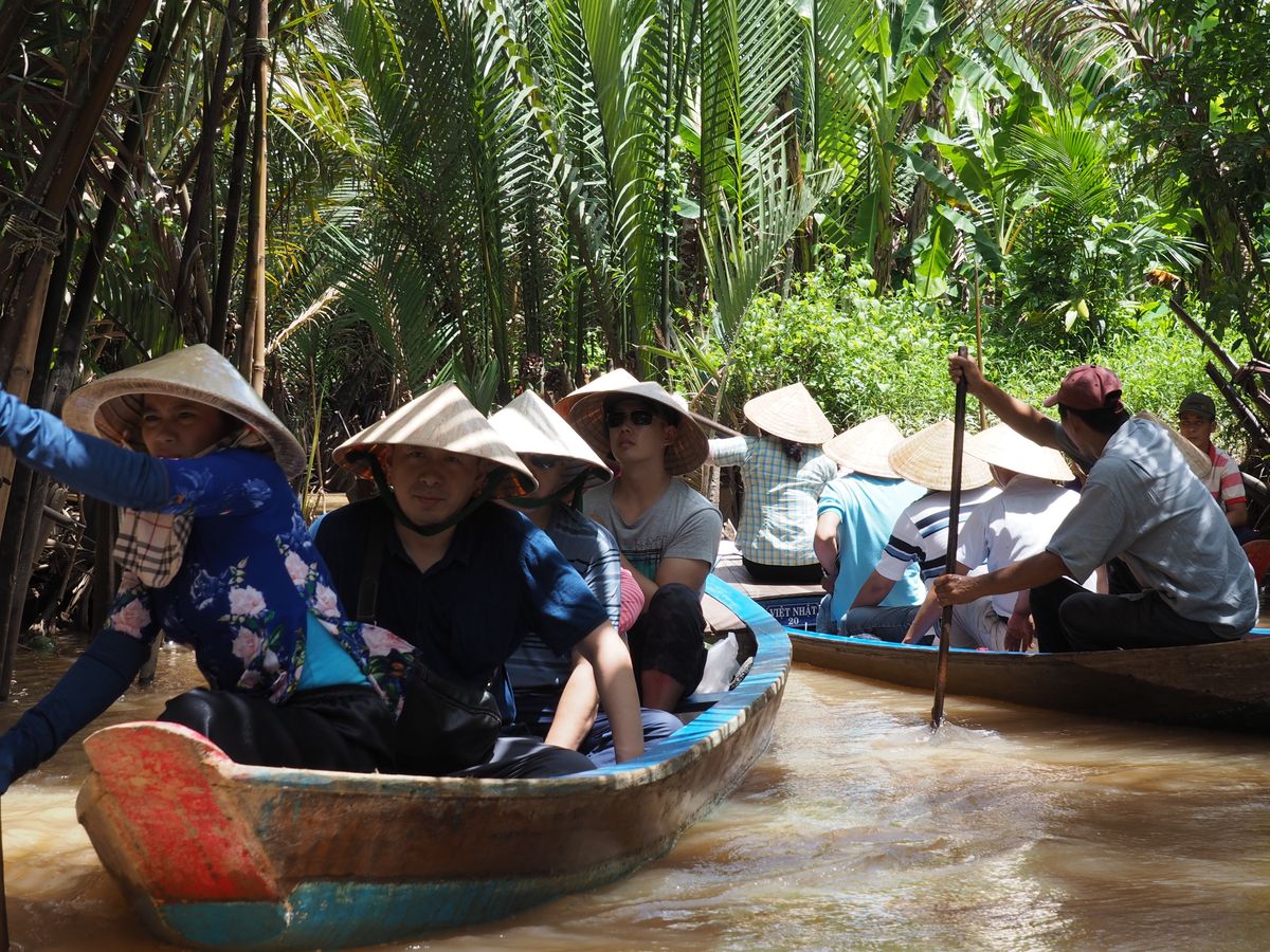 メコン川支流の川下りは素敵でした。ジャングルを小舟で進んで行くような素敵な体験でした。船頭さんが舵をとって気持ちよく穏やかに川下り体験です。ベトナムのかさを借りて気分はベトナム人です。