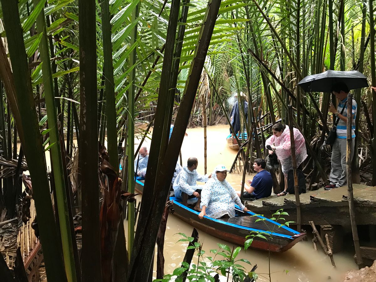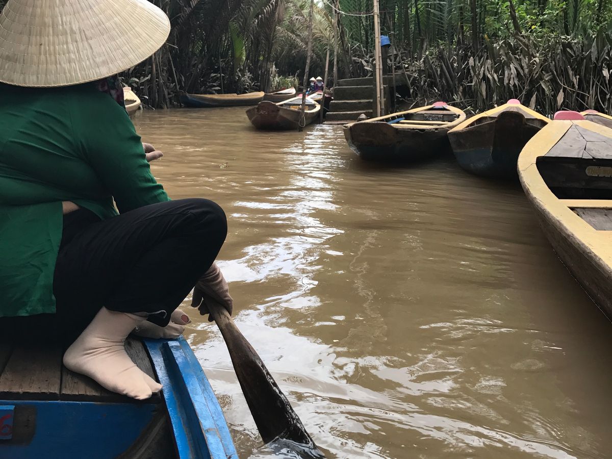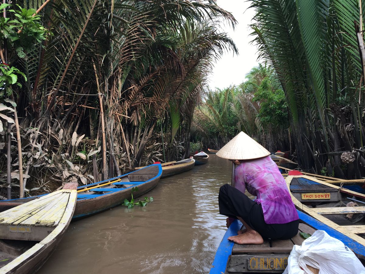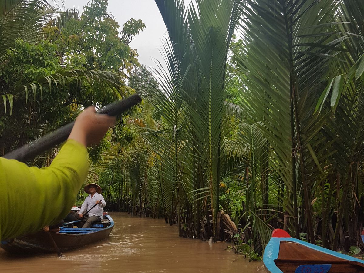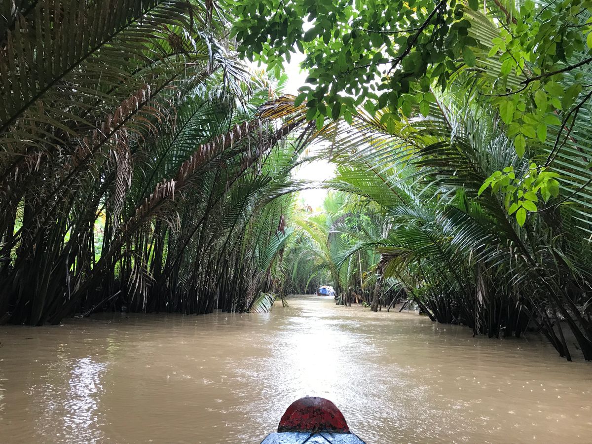 メコン川支流の川下りは素敵でした。ジャングルを小舟で進んで行くような素敵な体験でした。船頭さんが舵をとって気持ちよく穏やかに川下り体験です。ベトナムのかさを借りて気分はベトナム人です。