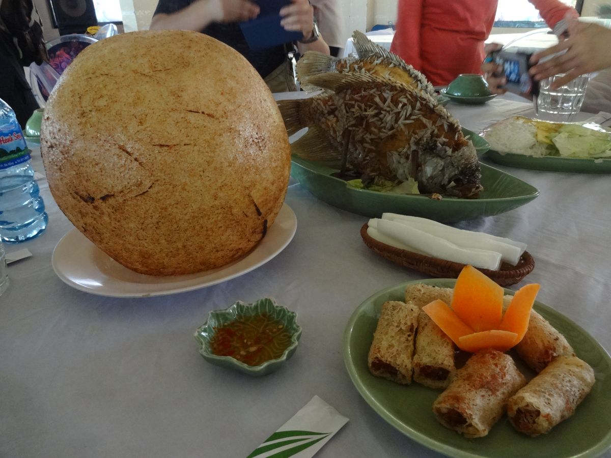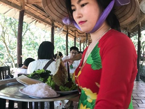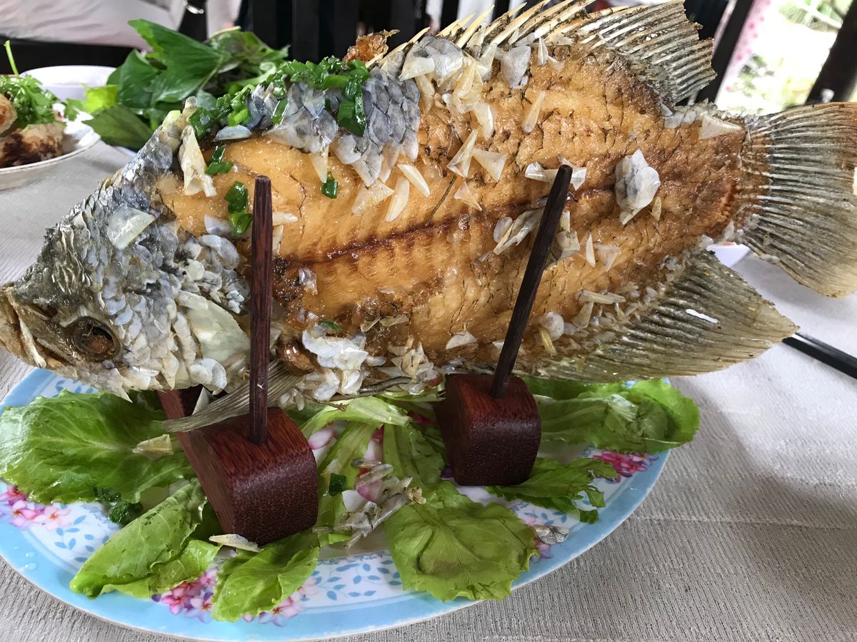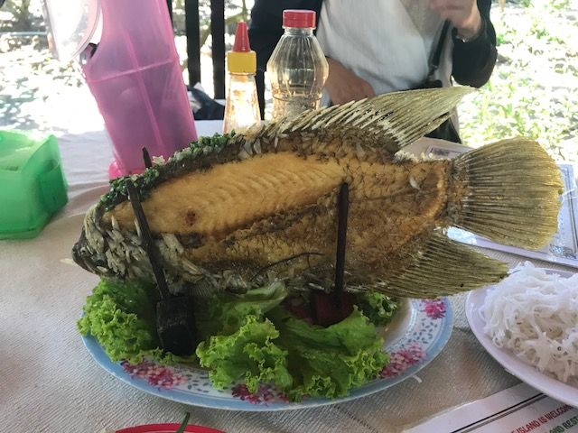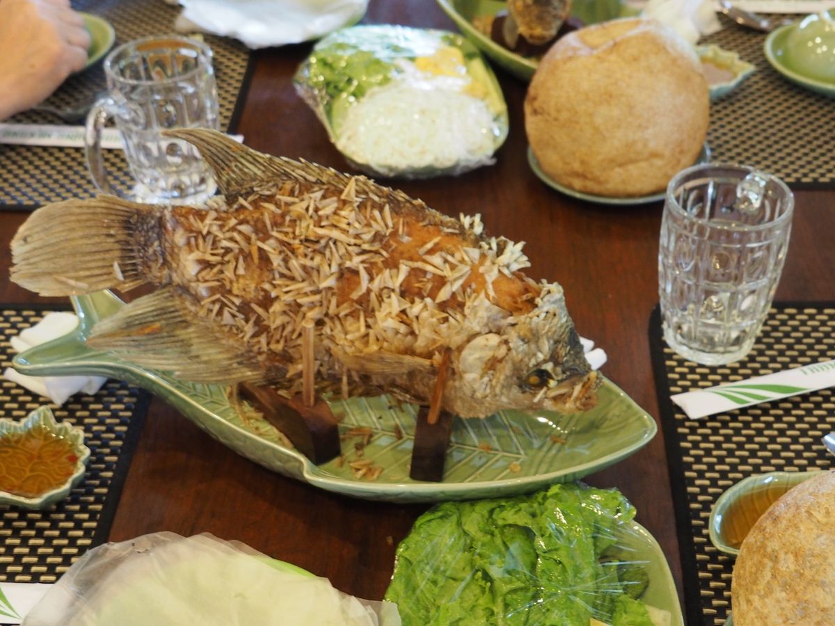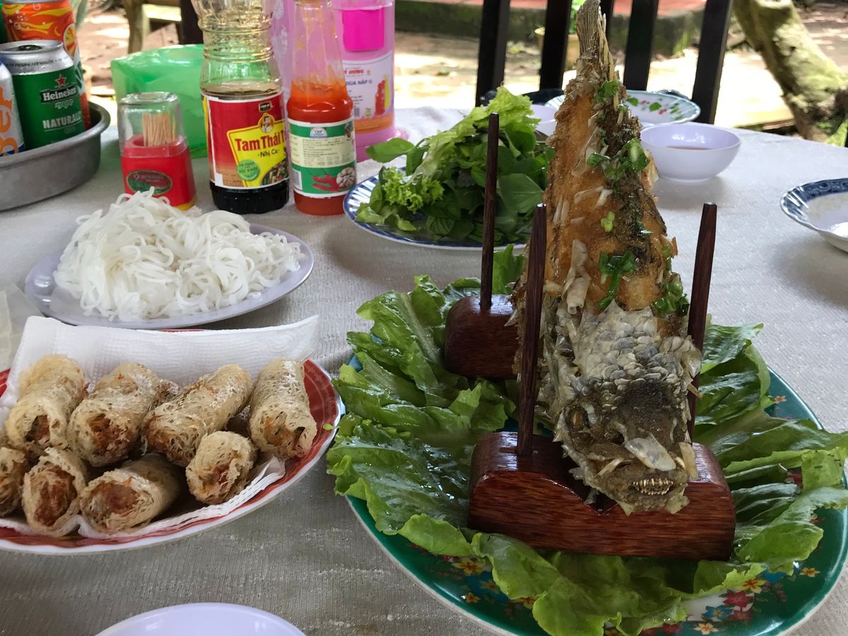 食事は、農家の方の手作り。この流れで私はすっかり衛生面が気になってしまいました。象耳魚の料理が名物とのこと。川魚の姿揚げを何人かでライスペーパーに他の野菜といっしょに包んで食べました。後は揚げ春巻き、最後にベトナムの焼きそばのような麺がでてきました。麺は明らかにインスタントと私たちのテーブルでは。。。そんな感想でした。