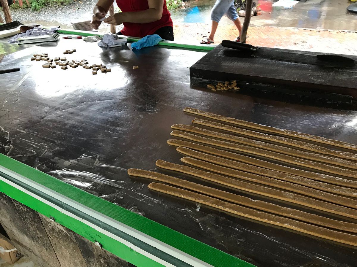 蛇は苦手なので遠巻きに見ていました。ココナッツ飴工場は、いわゆる農家でやっている昔の家内工業!?ツアーコンダクターが、白人の人にカッティングマシーンとしきりに言っていましたが、要は包丁。。。確かにカッティングマシーン!?