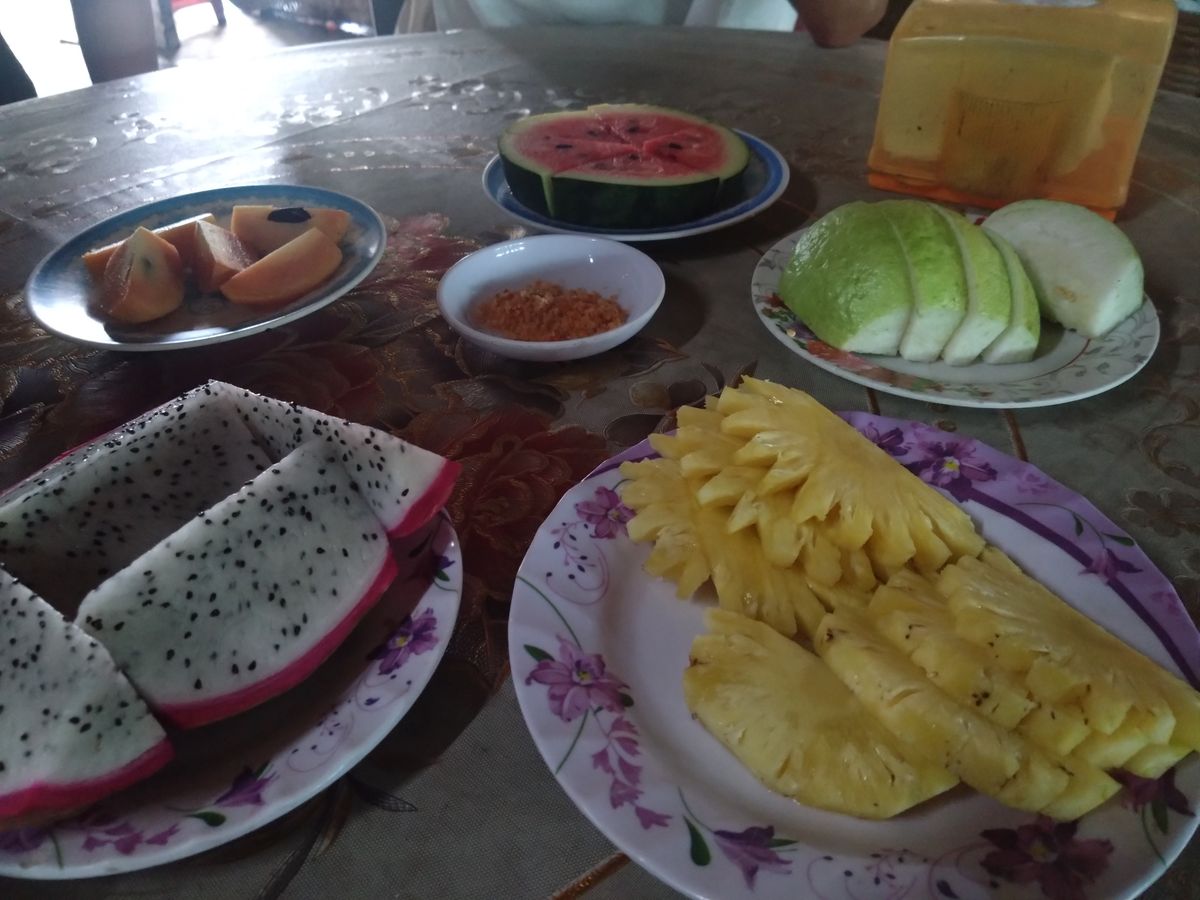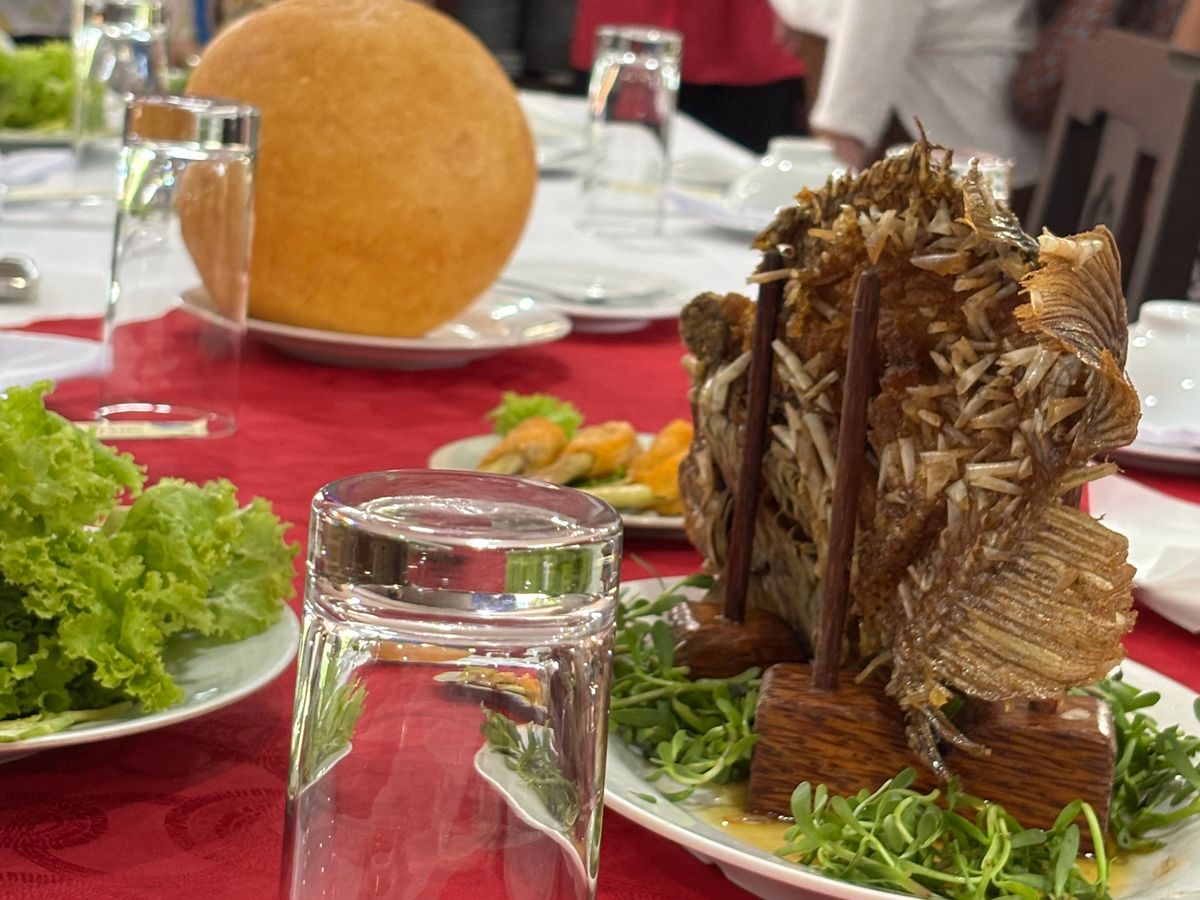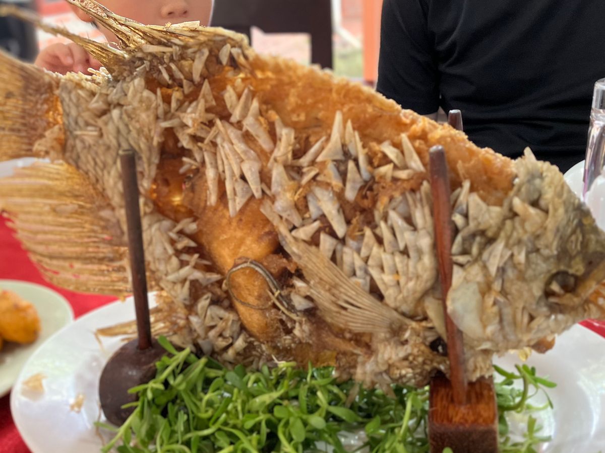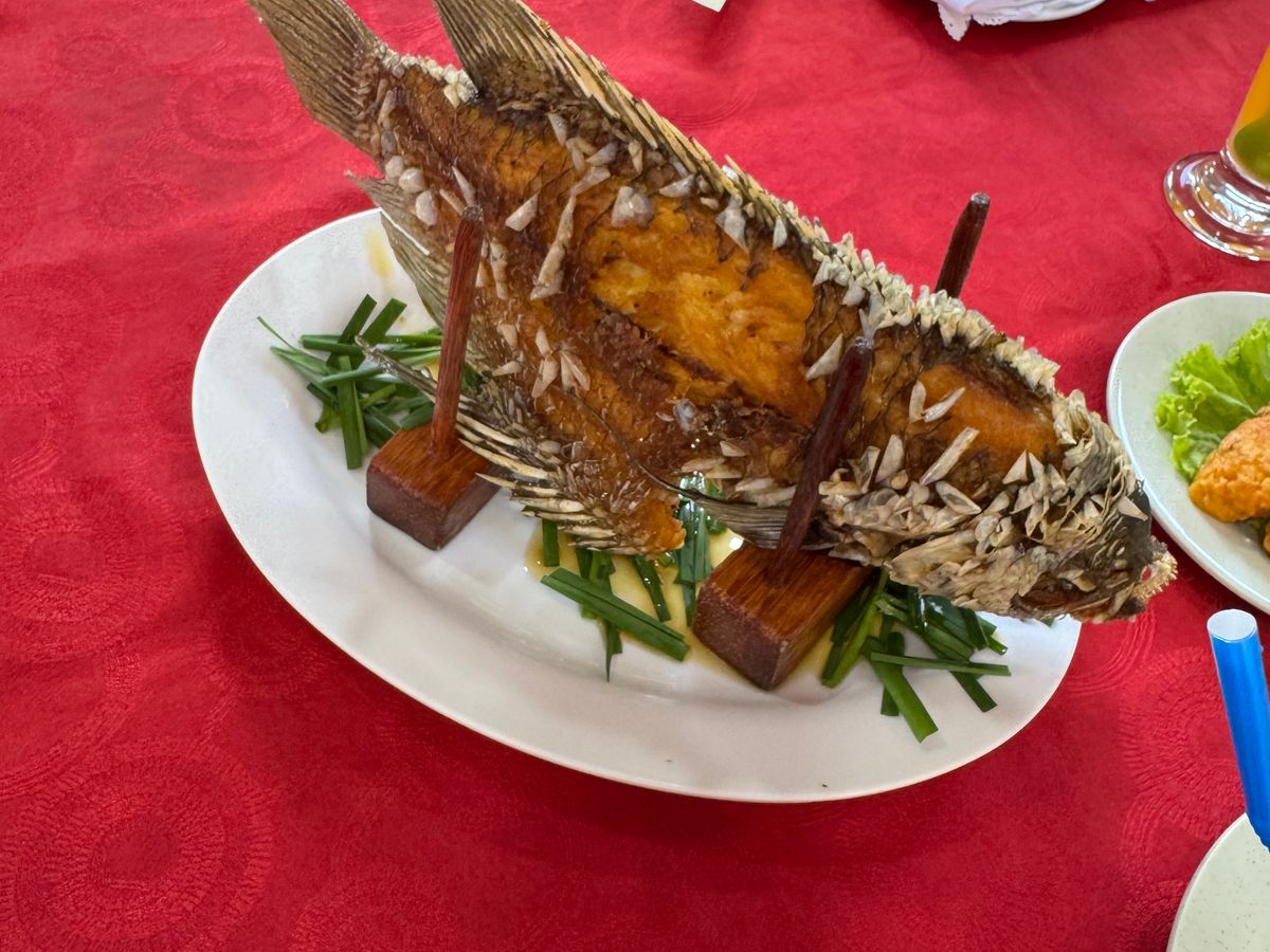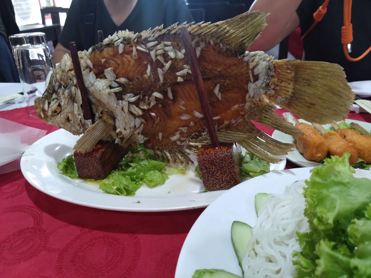 何種類ものフルーツを試食しました。最後のランチでは、象耳魚を丸ごと揚げたものが出てきました。最初、店員さんが食べ方を見せてくれるので、しっかり観て4人で分けて食べました。
