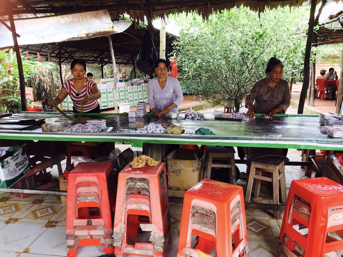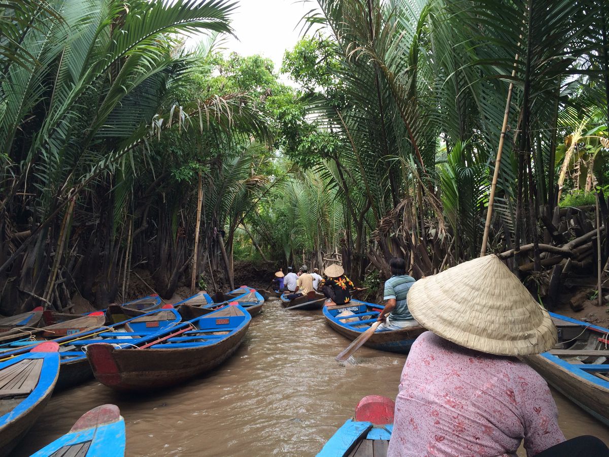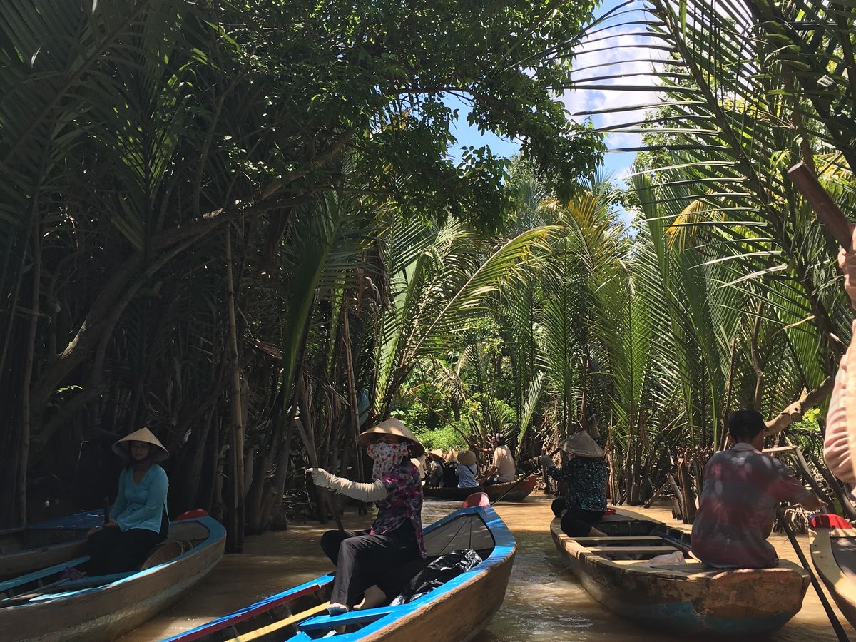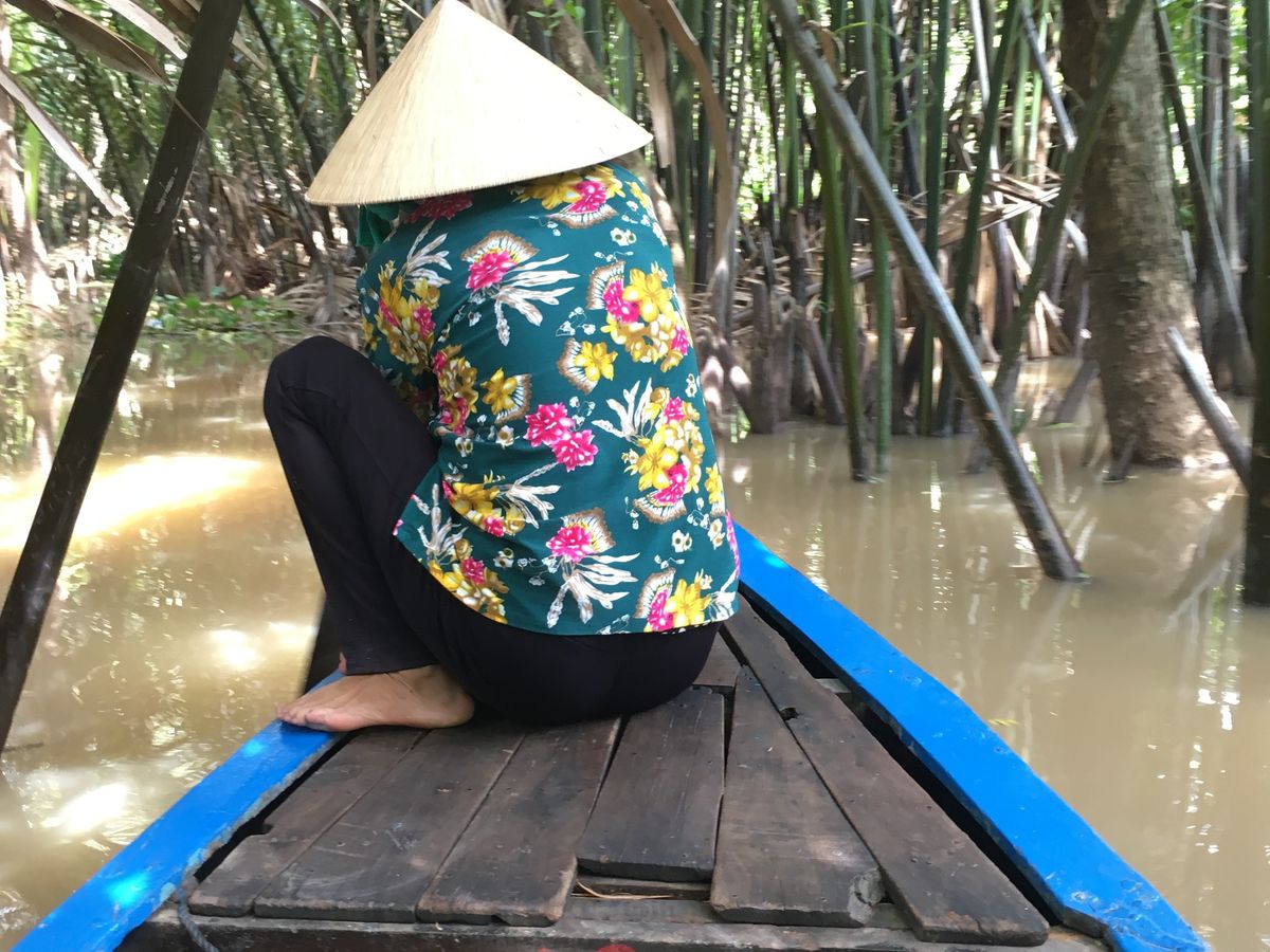 手漕ぎボートはベトナムでよく見かけたる三角帽子を被り、川をすいすい。当日は涼しくきもちよかったです。ココナッツ工場や、ヘビの首巻体験(?)等々、やや観光向けに作られたのかな?とも思いましたが、非日常的すぎる体験をさせて頂き、充実した時間をすごせました。