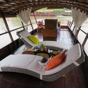 中央にあるふかふかのリクライニングチェアに横になり、のんびりメコン川をクルーズします。