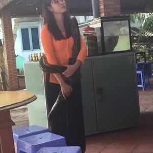 メコン川クルーズでは、船で島へ渡り、はちみつを使ったお茶を飲みました。そこでとても大きなヘビを首に巻いて写真を撮ることができます(無料)。おとなしいのはわかっているけれど、すごくドキドキしました。