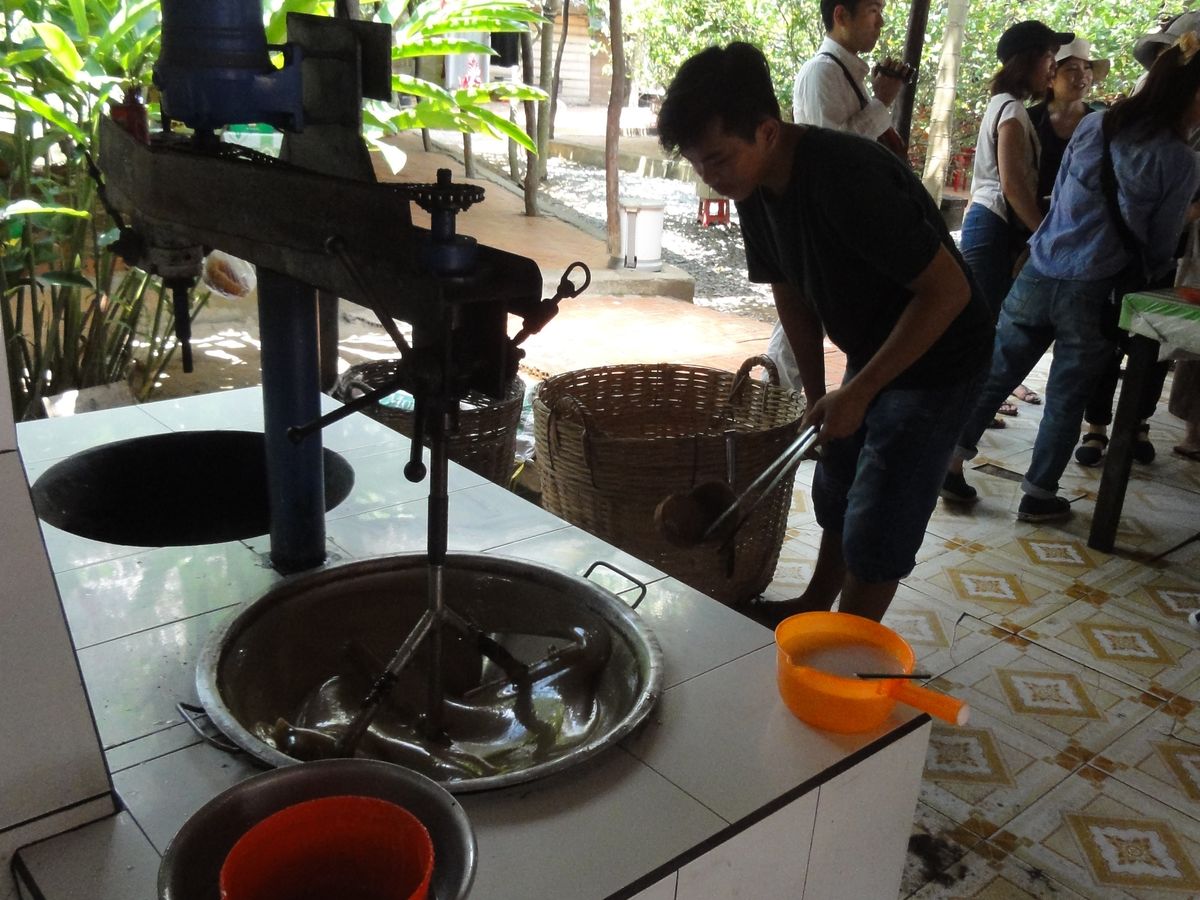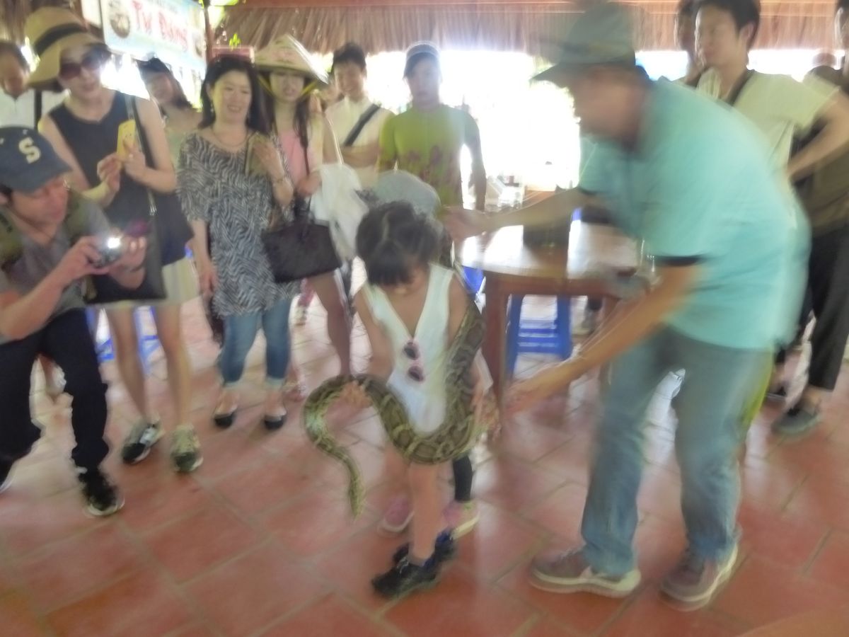 7年前の2010年にも同じツアーに参加しましたが、その時のガイドさんも今回と同じドゥックさんでした。ビックリ偶然でした。日本語が上手で、ピコ太郎のことも知っていて文化についても詳しいです。当日の午前中はあいにくの雨でカッパを着ての行動となりましたが、大雨ではなく楽しく過ごせました。ボートに乗ってジャングルクルーズやメコン川クルーズ、民謡を聞いてフルーツの試食、ココナッツキャンディ作りの見学や試食、ヘビ使いになったり、昼食はあまり美味しくないエレファントフィシュを食べたり、最後はお寺の見学、そしてフォーの無料券付。