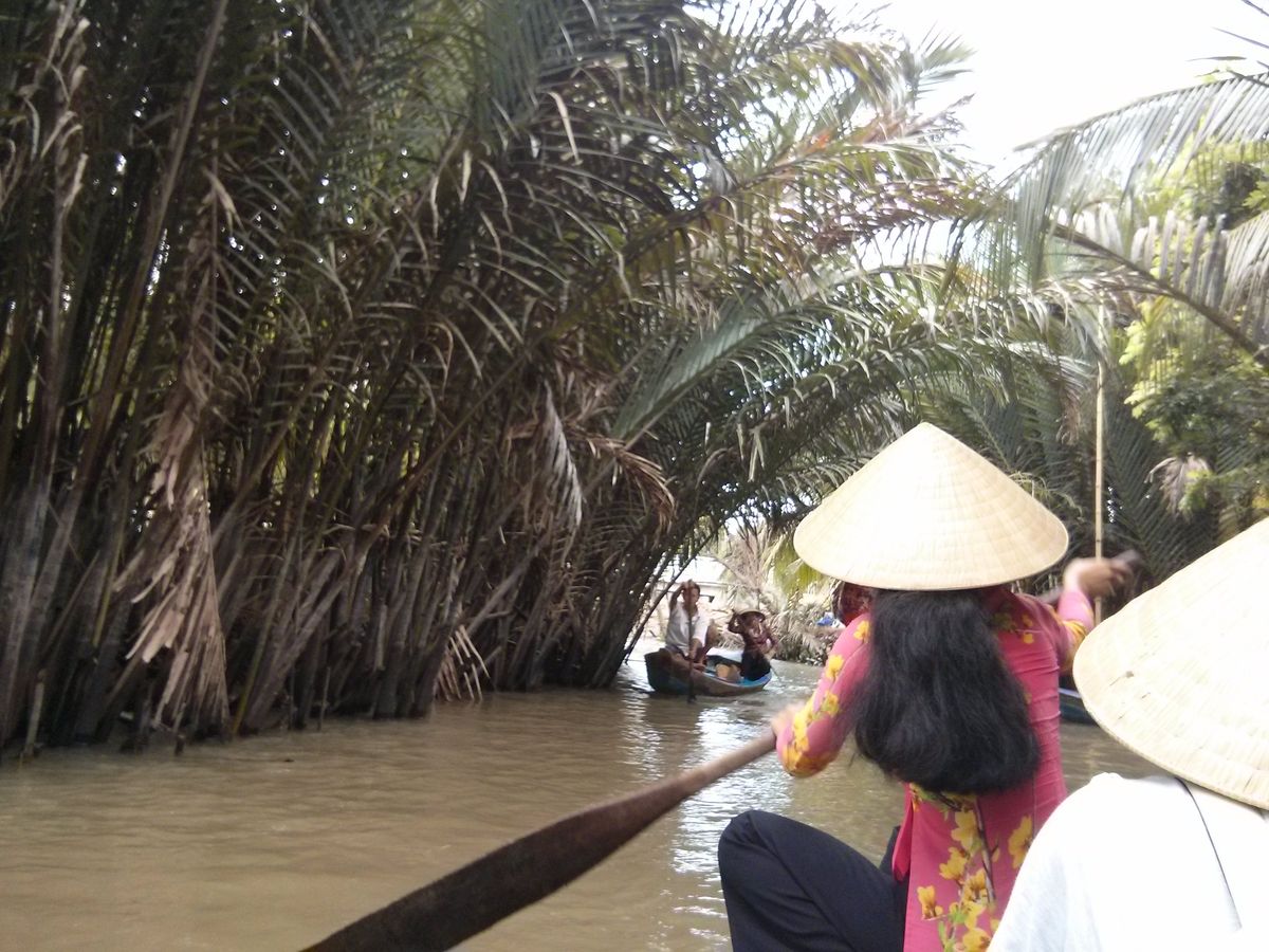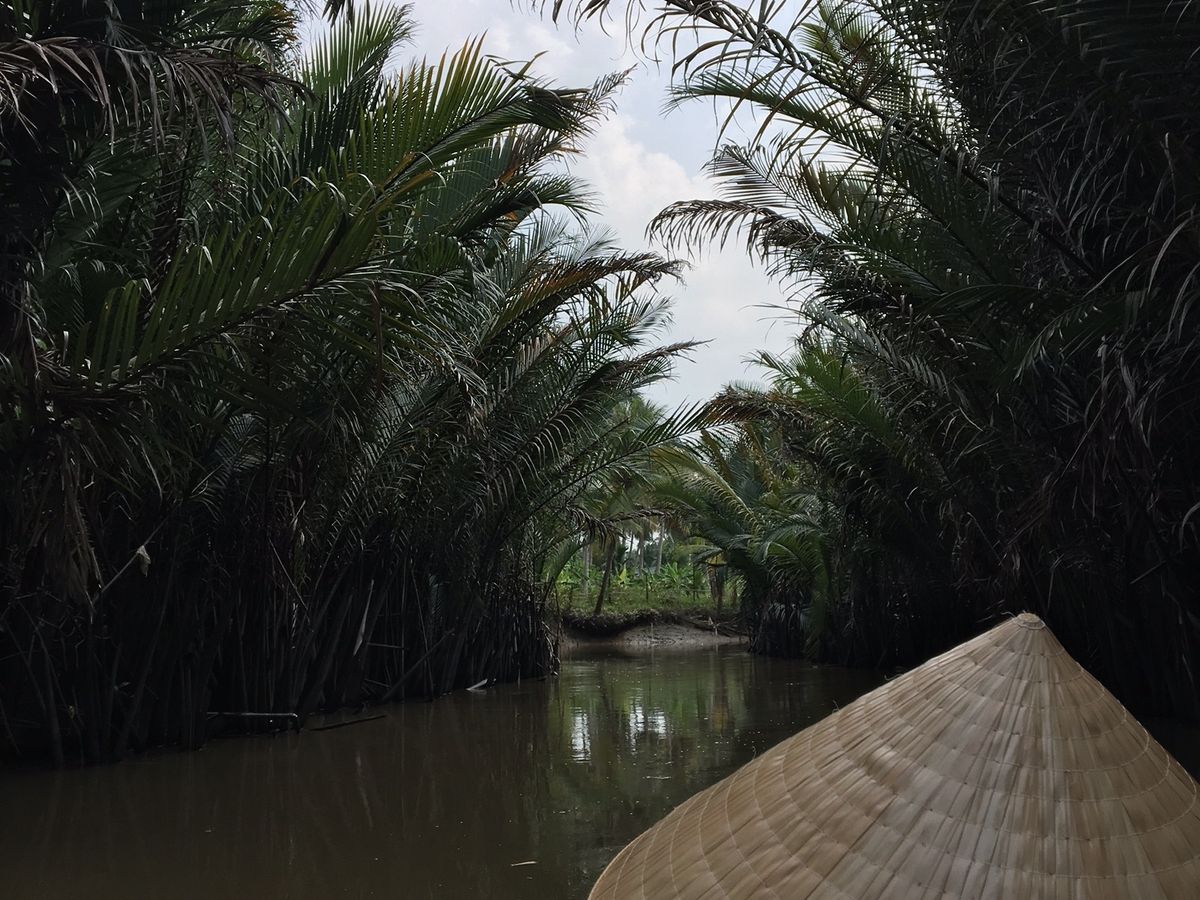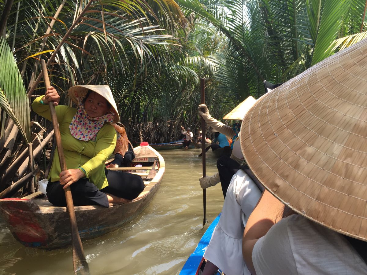 はじめに到着したところからボートに乗って川を渡り、たどり着いたところで、養蜜場をさらっと見学し、現地のフルーツをいただきながら音楽をきき、ココナッツキャンディー工場でできたてのまだ暖かくて柔らかいキャンディを抱き、ついにメコン川デルタクルーズに。もちろん観光地なので、手漕ぎボートも渋滞状態ではあったんですが、熱帯雨林のなかを手漕ぎボートにとって、ベトナム傘を被ってのんびりくだるのはやっぱり行けてよかったと思いました。