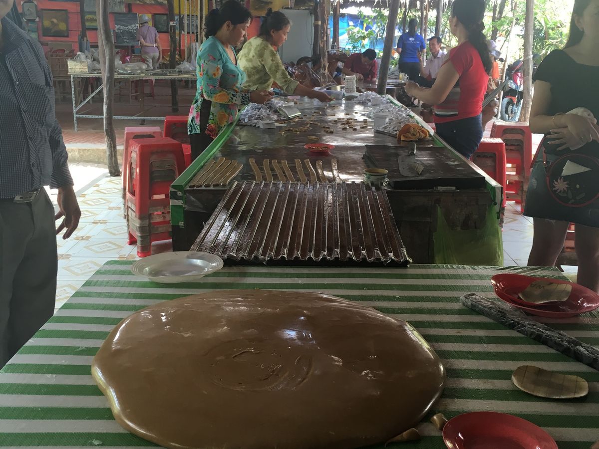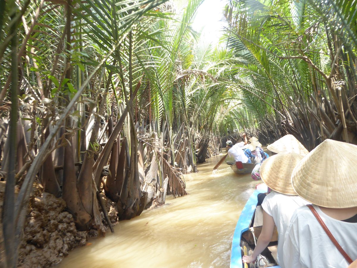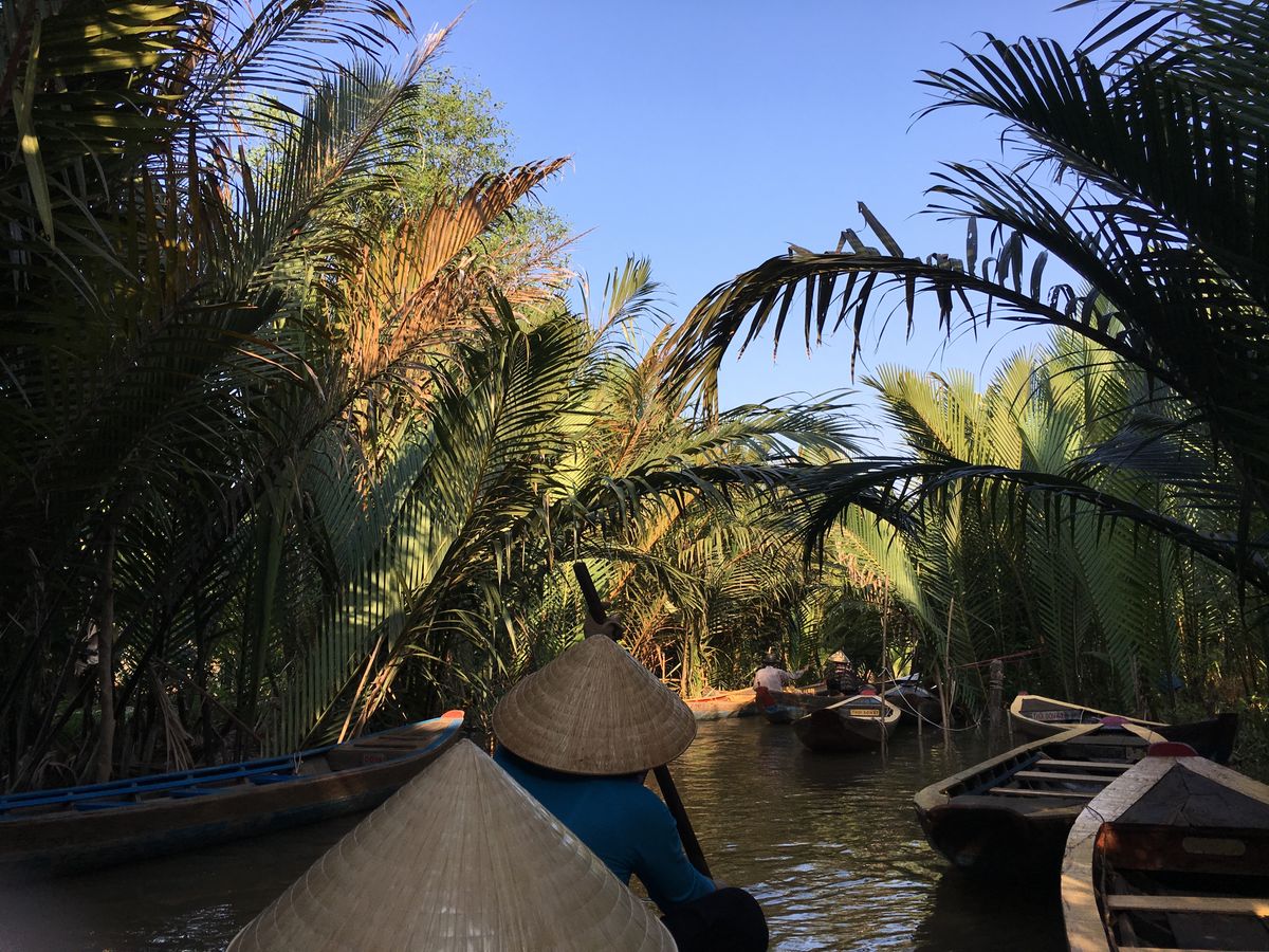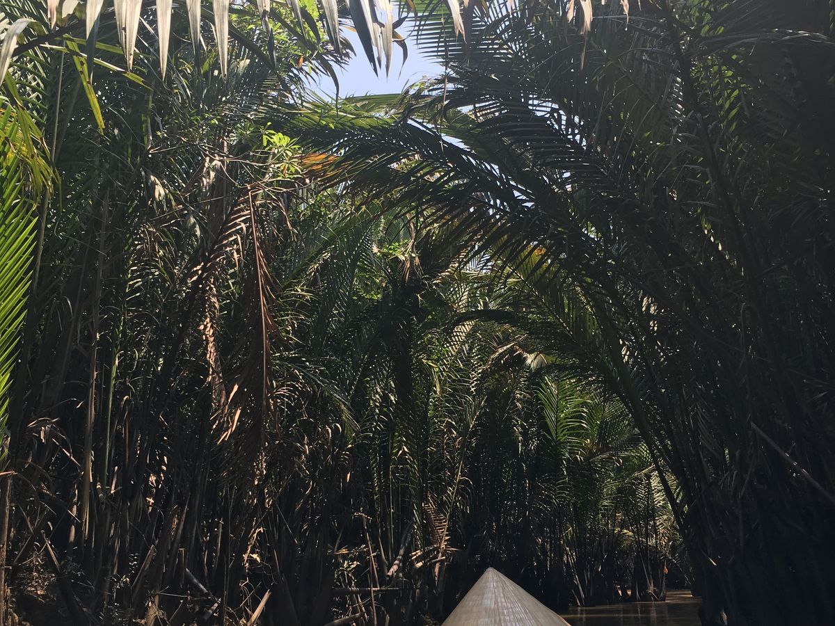 はじめに到着したところからボートに乗って川を渡り、たどり着いたところで、養蜜場をさらっと見学し、現地のフルーツをいただきながら音楽をきき、ココナッツキャンディー工場でできたてのまだ暖かくて柔らかいキャンディを抱き、ついにメコン川デルタクルーズに。もちろん観光地なので、手漕ぎボートも渋滞状態ではあったんですが、熱帯雨林のなかを手漕ぎボートにとって、ベトナム傘を被ってのんびりくだるのはやっぱり行けてよかったと思いました。