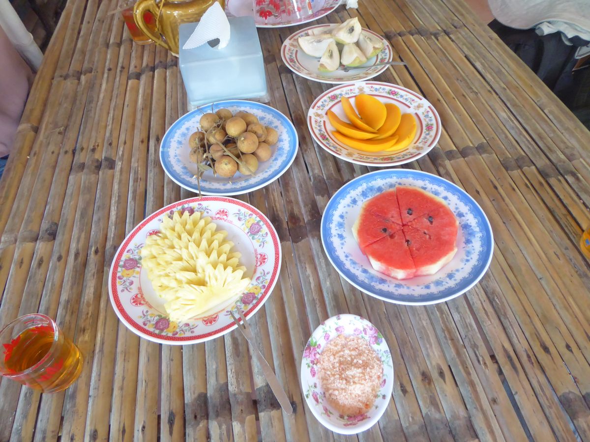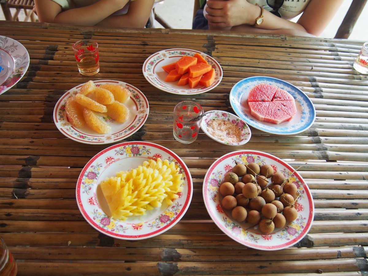 メコン川では、ココナッツキャラメル、フルーツ、はちみつなどを頂き、現地の方のお家を