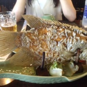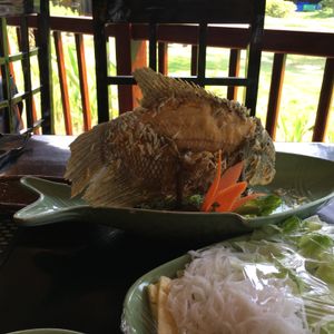 道中の観光客用の食事施設で昼ごはん。他のツアー客でいっぱい。象耳魚や生春巻きなど。