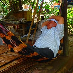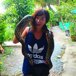 名前はフアンですが、不安にさせることはないです。といきなりのギャグ。楽しい方でした。メコン川はもっと長距離クルーズするかと思いましたが乗船時間は10分程度。島に渡ってから色々なタイアップ土産物屋に連れて行かれていく。まあよくあることで軽く流しました。大蛇をクビにかけるのは面白かった。小舟でメコンの支流を下るのも10分程度で少々物足りなかった。