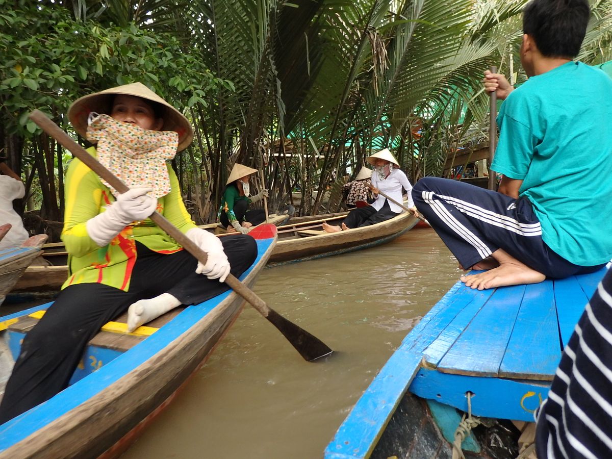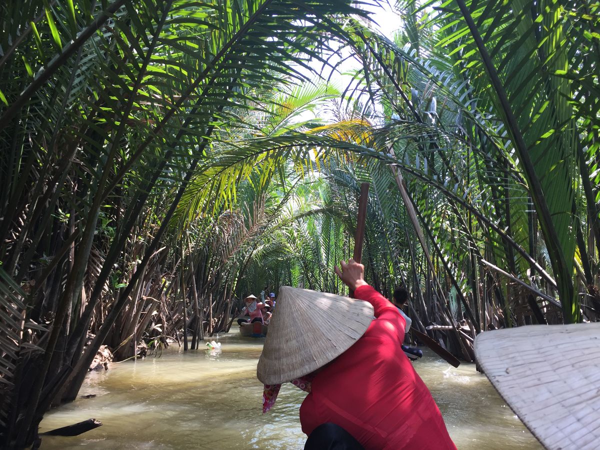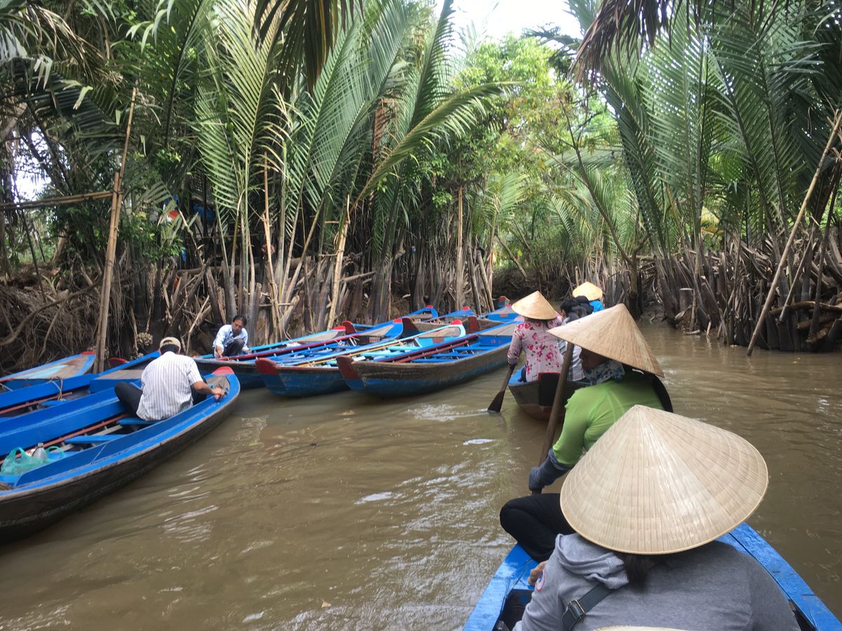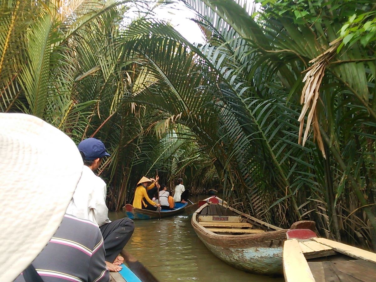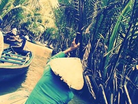 マングローブを進む手漕ぎボートでは、借りたベトナム笠をかぶり、ガイドさんと仲よく写真を撮ったり、すれ違うボートに手を振ったり大はしゃぎ。