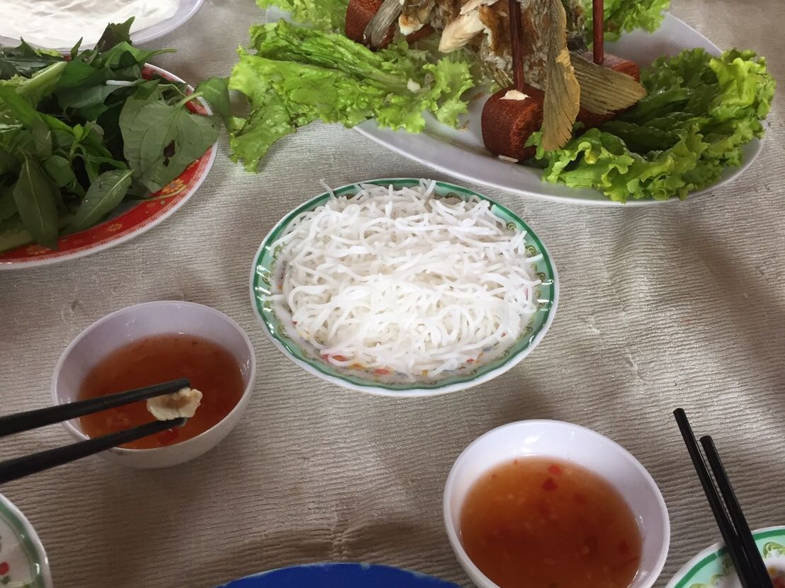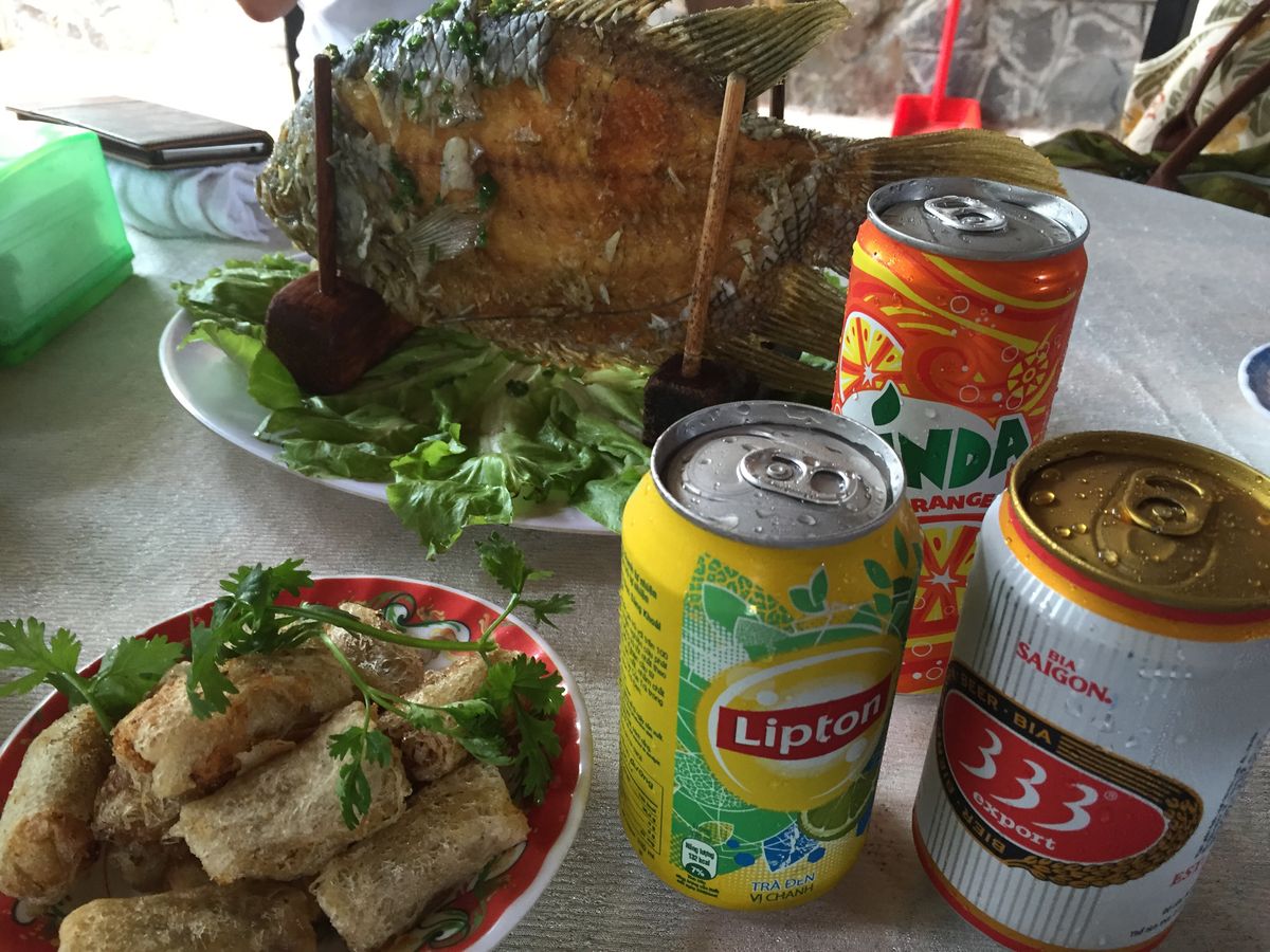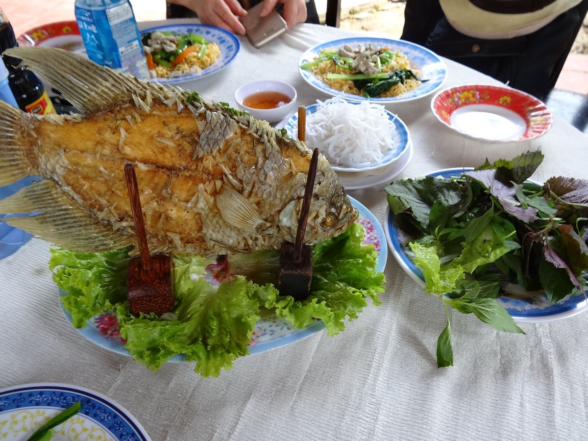 またバスで移動して、お昼はツアー参加者全員でレストランで象耳魚を取り分けてもらい、ライスペーパーで巻いて食べました。そのほかにもチャーハンのようなライスや鍋など、どれもおいしい食事でした。飲み物代は別にかかります。
