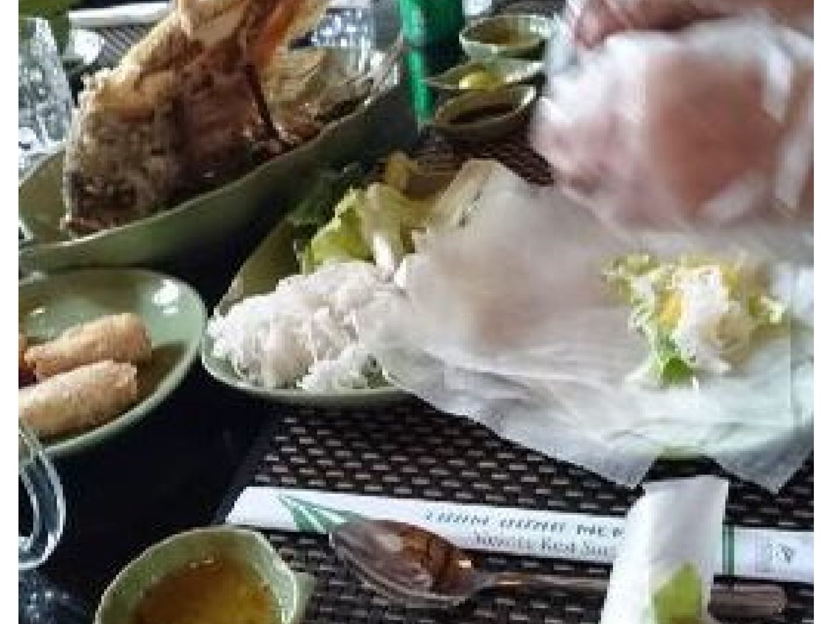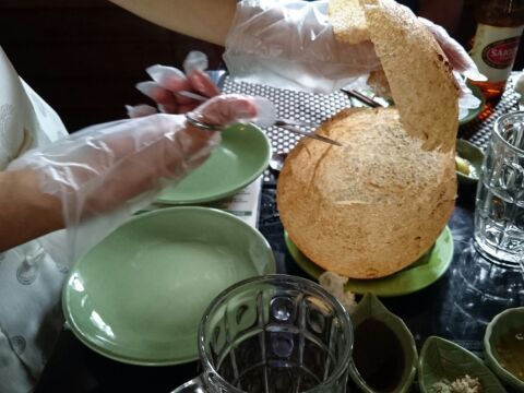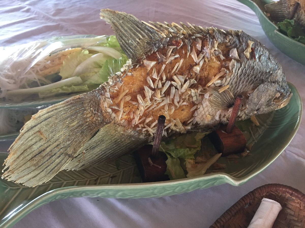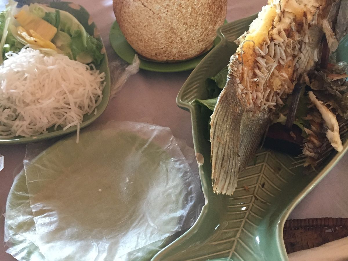 またバスで移動して、お昼はツアー参加者全員でレストランで象耳魚を取り分けてもらい、ライスペーパーで巻いて食べました。そのほかにもチャーハンのようなライスや鍋など、どれもおいしい食事でした。飲み物代は別にかかります。