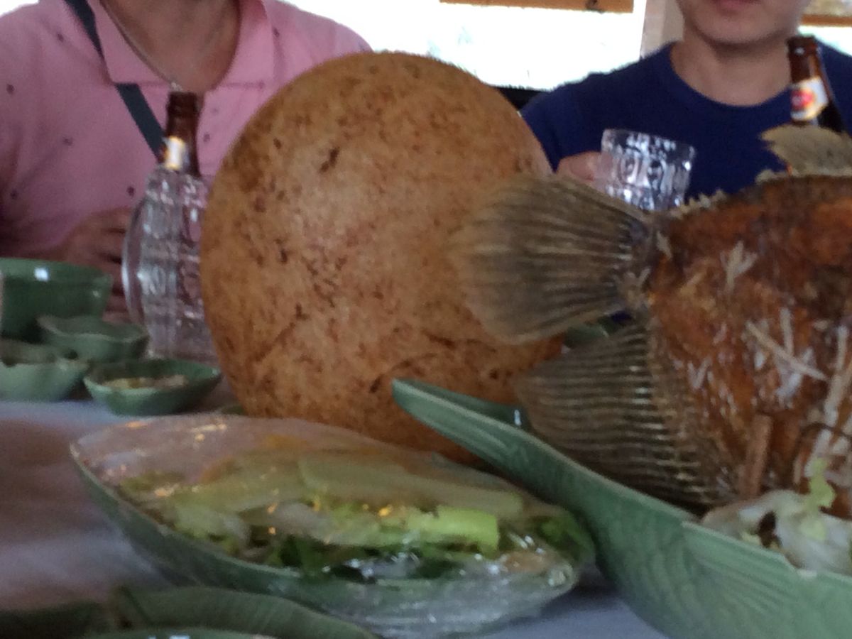 次はミトーに向かい、クルーズ前にレストランでランチです。ここでは名物のエレファントフィッシュをいただきました。ライスペーパーに巻いて食べたのですが、川魚の臭みもほとんどなく美味しかったです。そして球形に膨らんだ揚げ餅がとても美味しい!他にも海老、チャーハン、スープ、果物もいただき、お腹いっぱい。