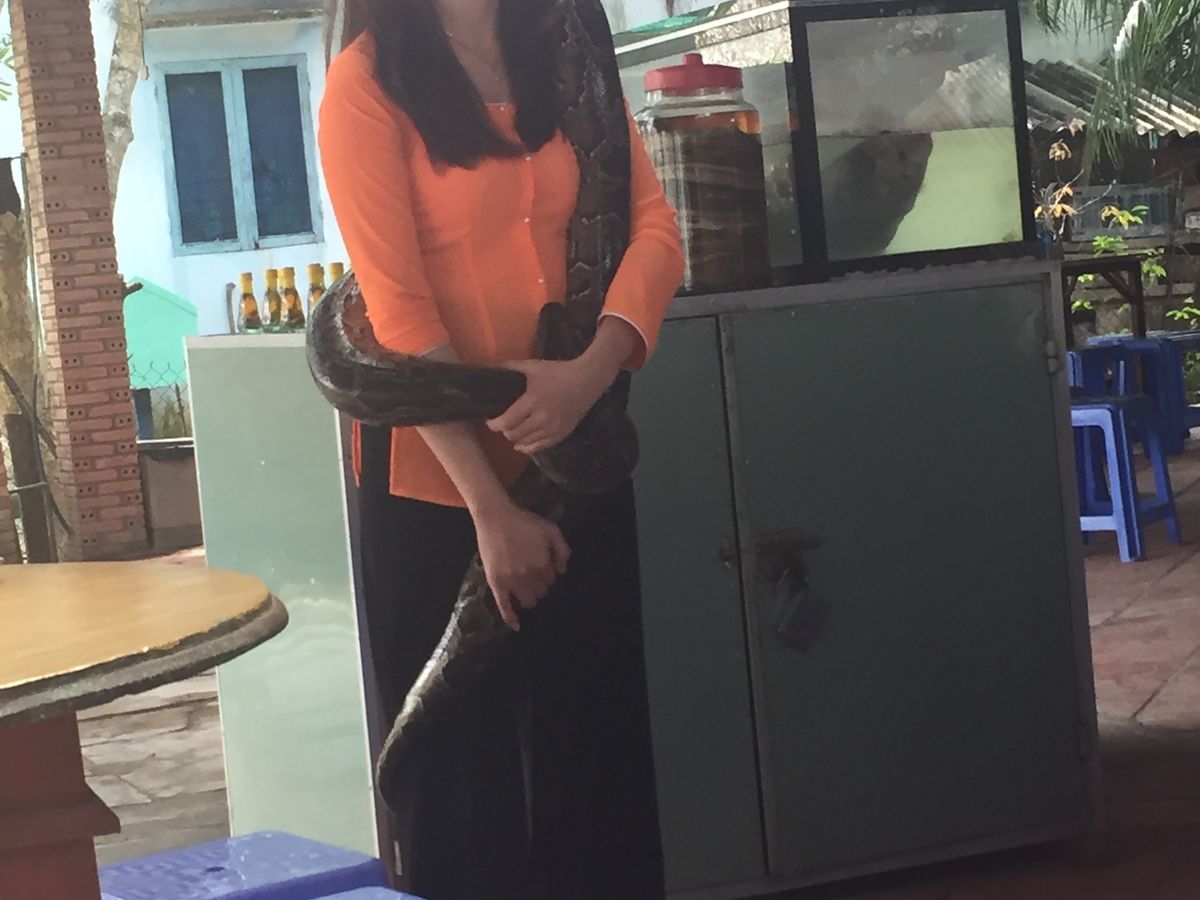 メコン川クルーズでは、船で島へ渡り、はちみつを使ったお茶を飲みました。そこでとても大きなヘビを首に巻いて写真を撮ることができます(無料)。おとなしいのはわかっているけれど、すごくドキドキしました。
