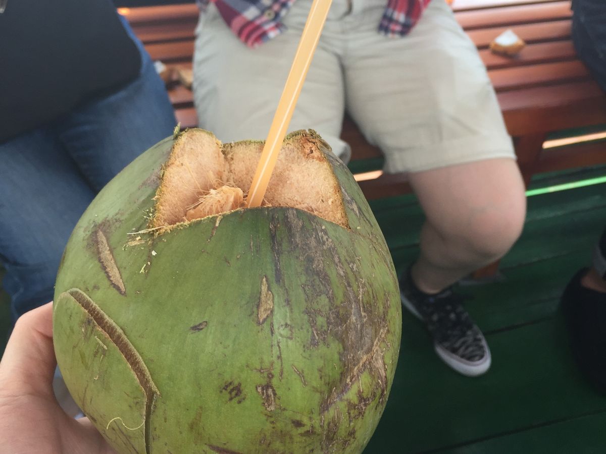 最後は手漕ぎボートでのクルーズです。ボートに乗るとき、ボートがぐらぐらするので一人ずつ慎重に乗船します。距離としては短いですが、ノンラーをかぶってのクルーズは楽しかったです。帰りのボートではココナッツウォーターもいただきました。