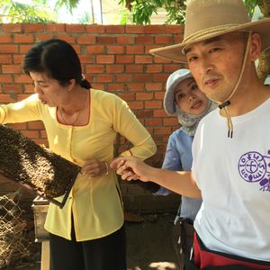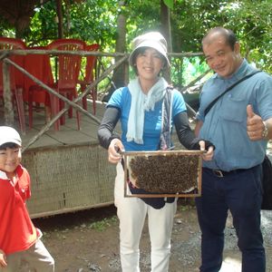 到着後、まずハチミツ農園。蜂の巣を持ってパチリ(ハチミツと金柑のお茶とフルーツをいただけます。)バトナム産のハチミツ・ローヤルジェリーは安全!とのこと。