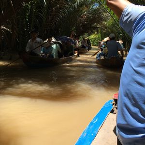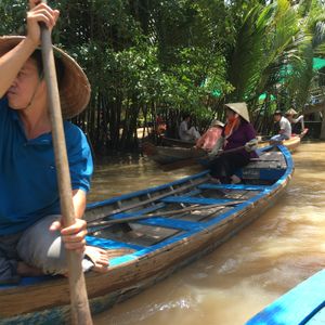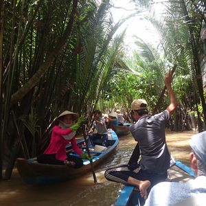船での移動、ハチミツ作り見学、ココナッツキャンディー工場見学、南国フルーツの試食と音楽鑑賞、メコン川クルーズ、象耳魚のランチ、中華街のお寺見学......