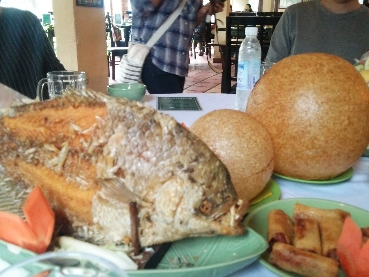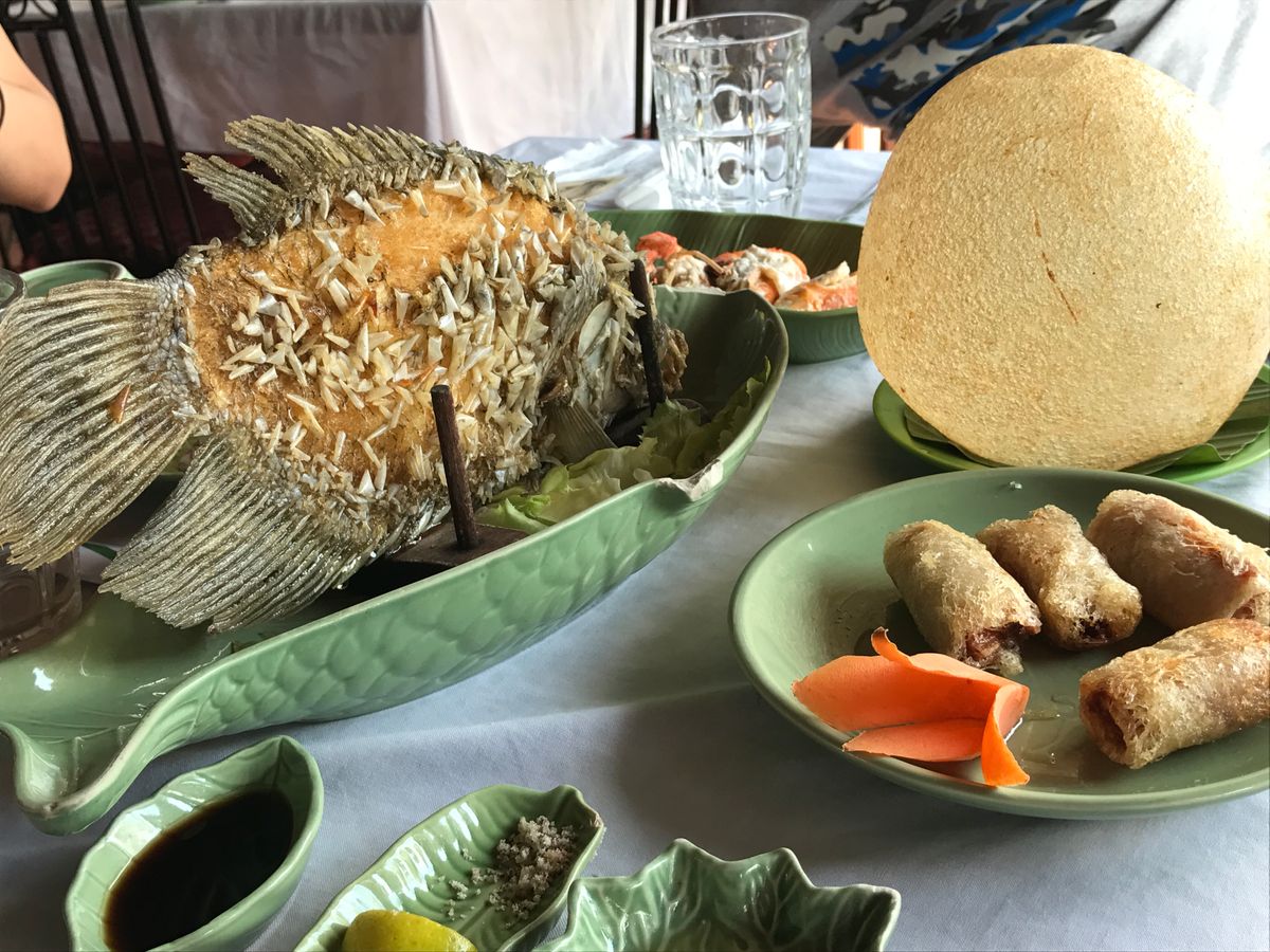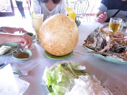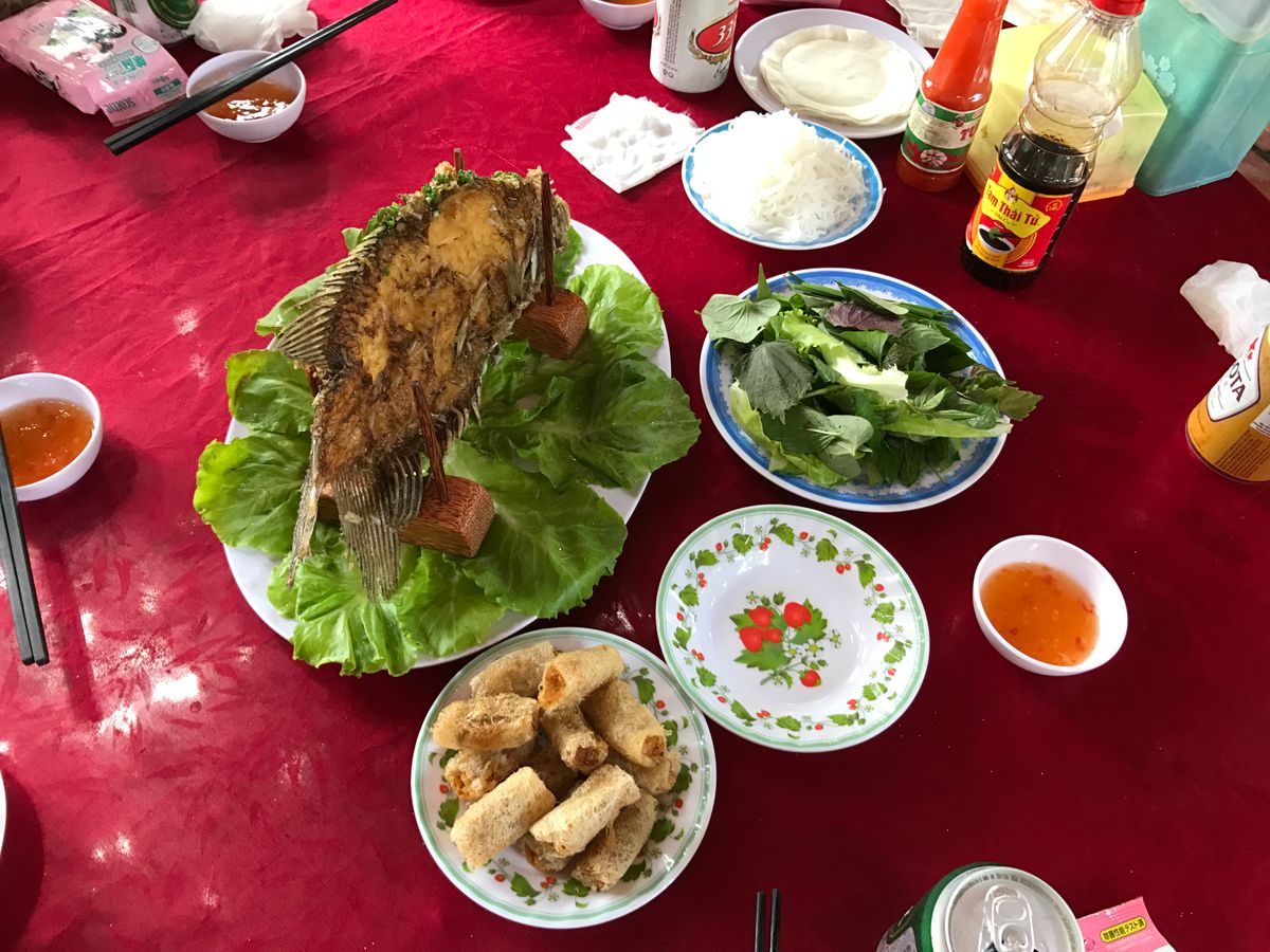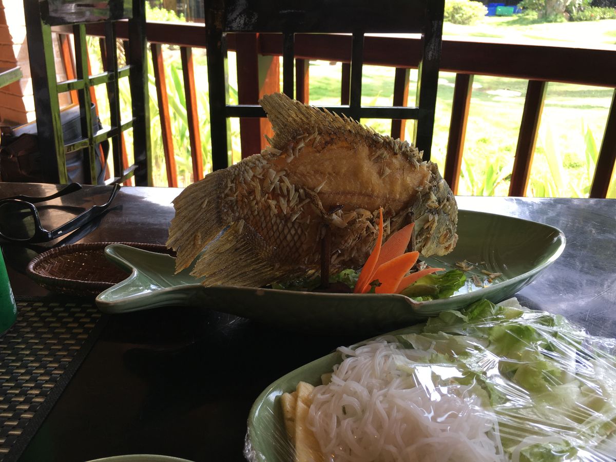 道中の観光客用の食事施設で昼ごはん。他のツアー客でいっぱい。象耳魚や生春巻きなど。