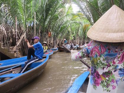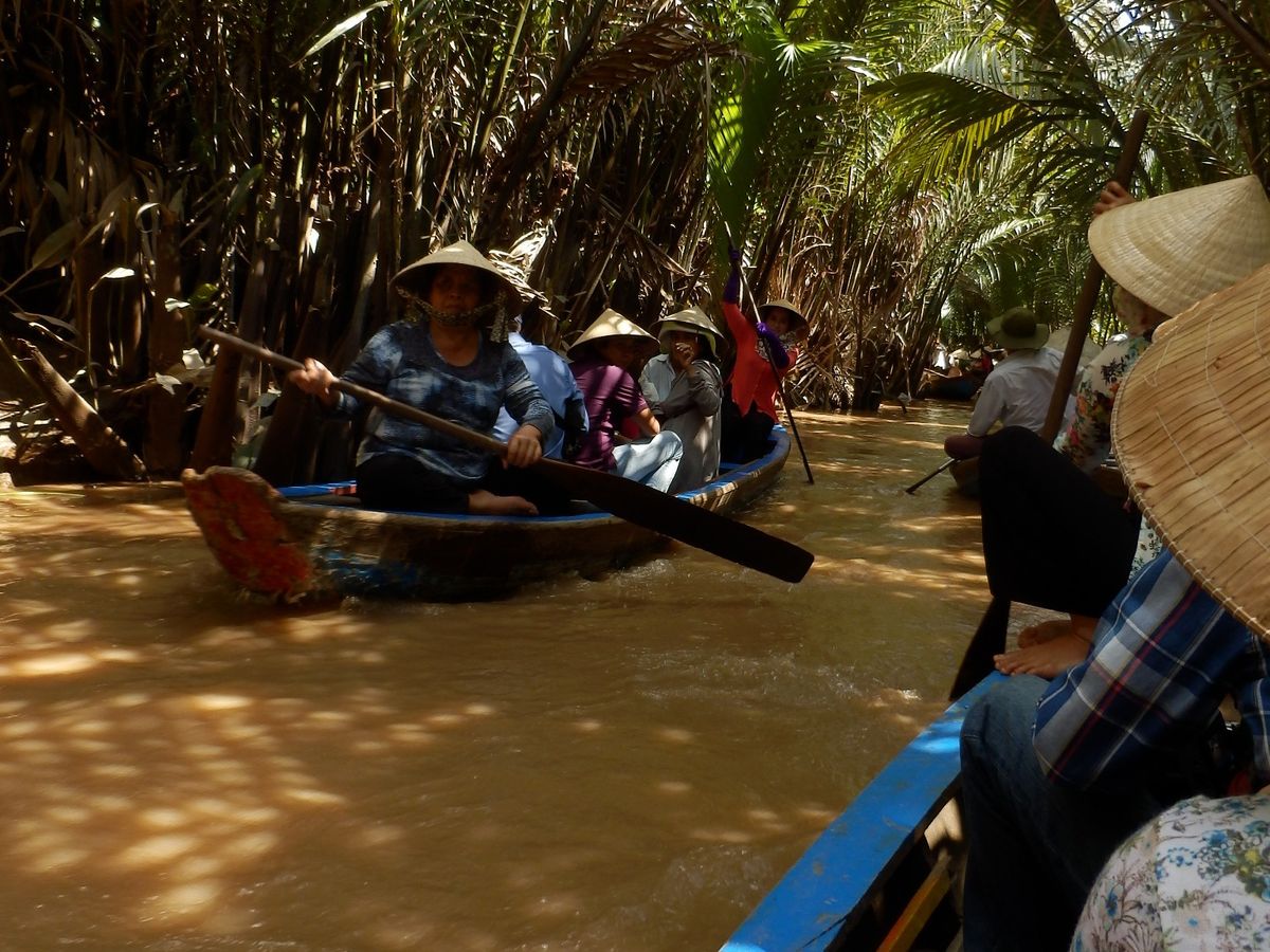 満足のツアーです。車窓の景色に、メコン川に、手こぎボート(これは、いかにもツアーのためのものという感じですし、思ったよりは短いのですがそれでもヤシの中の水路を行くのは面白く)、素朴なココナッツキャンディー工場見学に、楽しさ満載です。東南アジアのツアーでは、お昼の「名物料理」にがっかりすることもありましたが、このエレファントフィッシュの昼食は、とても美味しく、楽しめました。最後に立ち寄るティエンハウ寺も、市の中心部からは離れているので、個人で行くには少し不便ですので、とてもいいコースになっています。