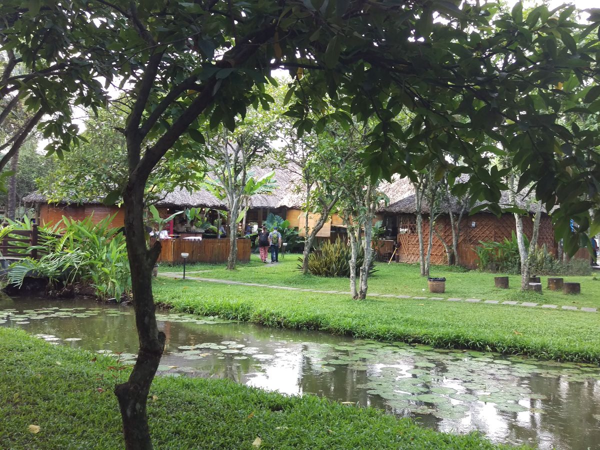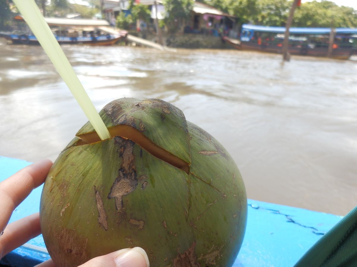 島で買ったノンラーをかぶってハチミツとローヤルゼリーを試食して購入し、ココナッツキャンディーを試食して購入し、作りの木製ボートで川下りをしてとてもいい経験が出来ました。
