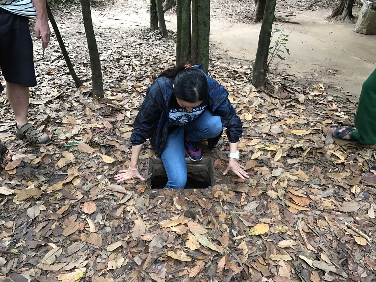 クチトンネルでは、敵の侵入を防ぐためにベトコンが巧みに作りあげた施設や当時の生活の再現を見学。トンネルは3種類の長さから選択。私達は真ん中の40メートルに挑戦。160㎝の私は、途中3度ほど天井に頭をぶつけ、結構きつかったですが、150㎝の娘は余裕だったらしく、最長コースにすれば良かったと言っています。前日に、ホーチミン市内観光の中で戦争証跡博物館を見ており、ベトナム戦争の残酷さに衝撃をうけていたので、感慨深いものもありつつ、ベトコンの知恵と工夫に感心させられました。