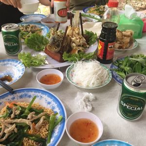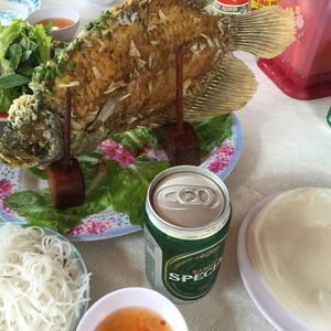 揚げた魚が立って運ばれてきた時は、どうやって食べていいのか分かりませんでしたが、ガイドさんがさばいてくれました。淡白でクセのない味。揚げ春巻き、焼きそば、スープと一緒に。