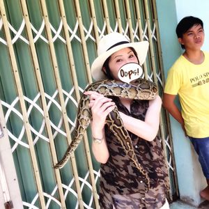途中、大きな蛇を首に巻いたり、船での移動中に良い写真が撮れ記念になりました。