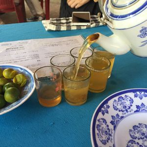 はちみつに金柑を搾ってお茶でわった、はちみつ茶と果物を頂きながら、伝統音楽の演奏と歌。