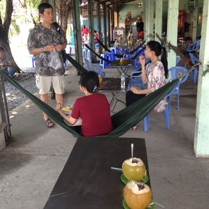 1人が傾くと船がひっくり返りそうで、スリル満点。船頭さんはたぶんベトナム語だけみたいですし、途中に何が出てくるわけでもないので、静かに船で進みます。ノンラーは軽くて、涼しく、髪の毛も潰れないし、少しベトナム人になった気分でした。