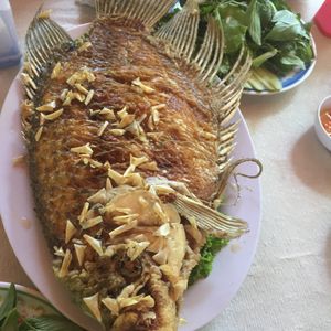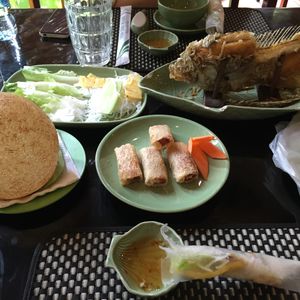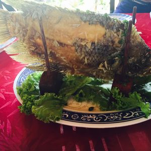 →お昼にいただいた象耳魚のランチは上げ春巻きや焼きそばみたいなのもでてかなりボリューム 満点です。象耳魚の味は少し大味な白身魚って感じでしょうか。。。