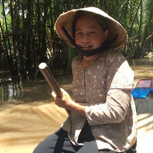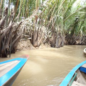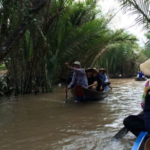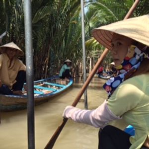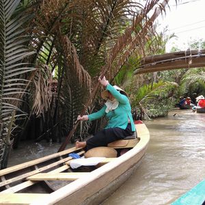 ホーチミンからから1時間半ほどでメコン川に着きました。そこは今までの景色とガラッと変わり、まさしくテレビや本で見ているような感じですごくテンションがあがりました。思ったほど暑くなくて果物たくさんなった木がちょうどいい感じで涼しかったです。島では島で採れたフルーツの試食やはちみつ入りお茶の試飲があり楽しかったです。特にココナッツあめはどれもおいしくて5つも買ってしまいました。ホーチミンで買うよりずいぶんお得だと思います。メコン川支流の乗船体験はわりとツアー客が多いのでワイワイとうるさいかと思っていましたが一隻一隻が間隔があり、静かな神秘な時間が感じられすごく感動しました。ガイドさんは日本語が上手で今回のツアーで何一つ不安を感じられなかったと思います。昼ごはんは今まで見たことのないような魚が出てきてびっくりしましたが意外と淡泊で美味しかったです。やきそばと揚げ春巻きはすごく美味しかったです。ただ前に何かの写真で見たまん丸に膨らんだもちがなかったのが少し残念でした。体験ツアーの中でも価値ありおすすめです。