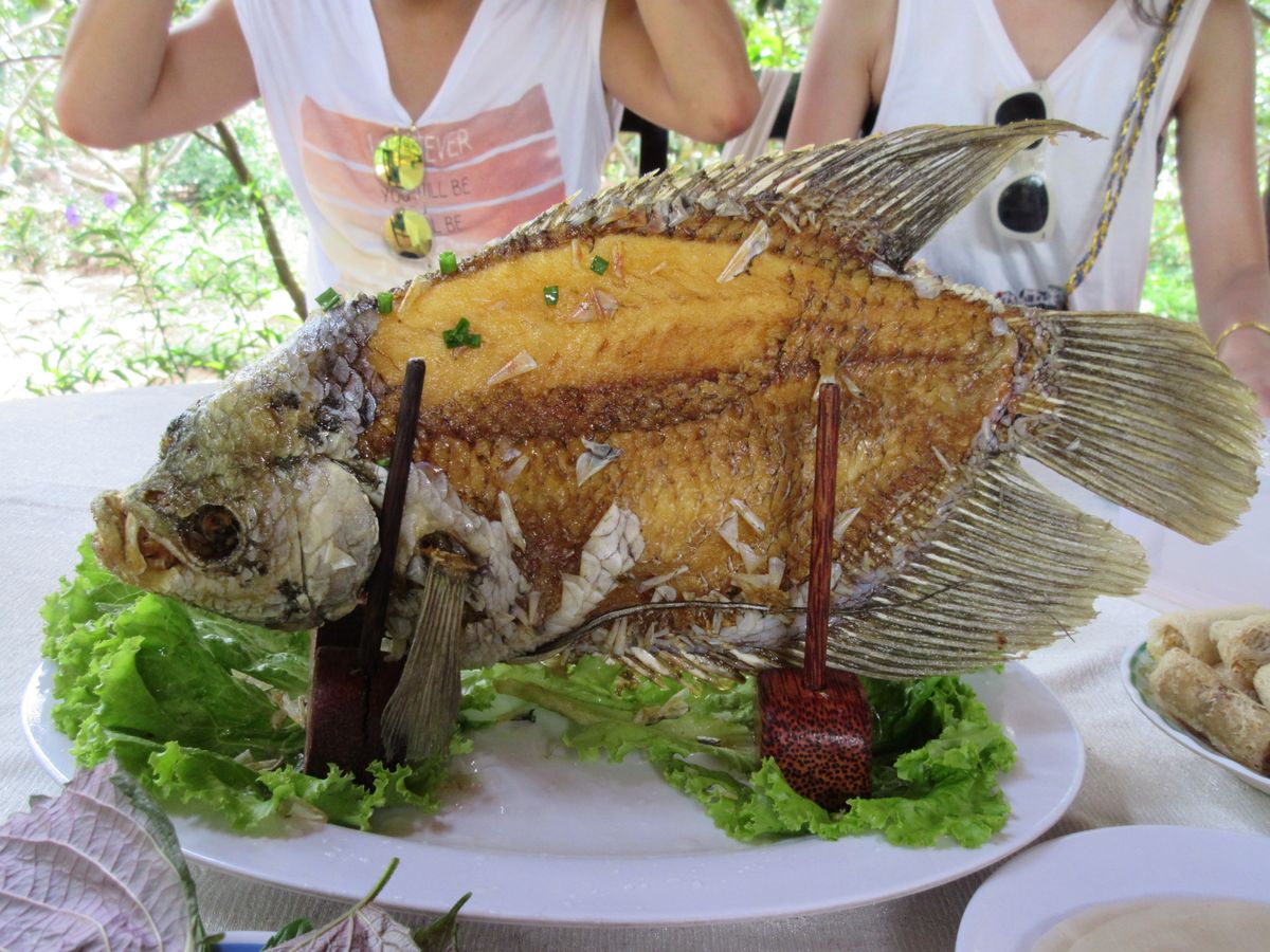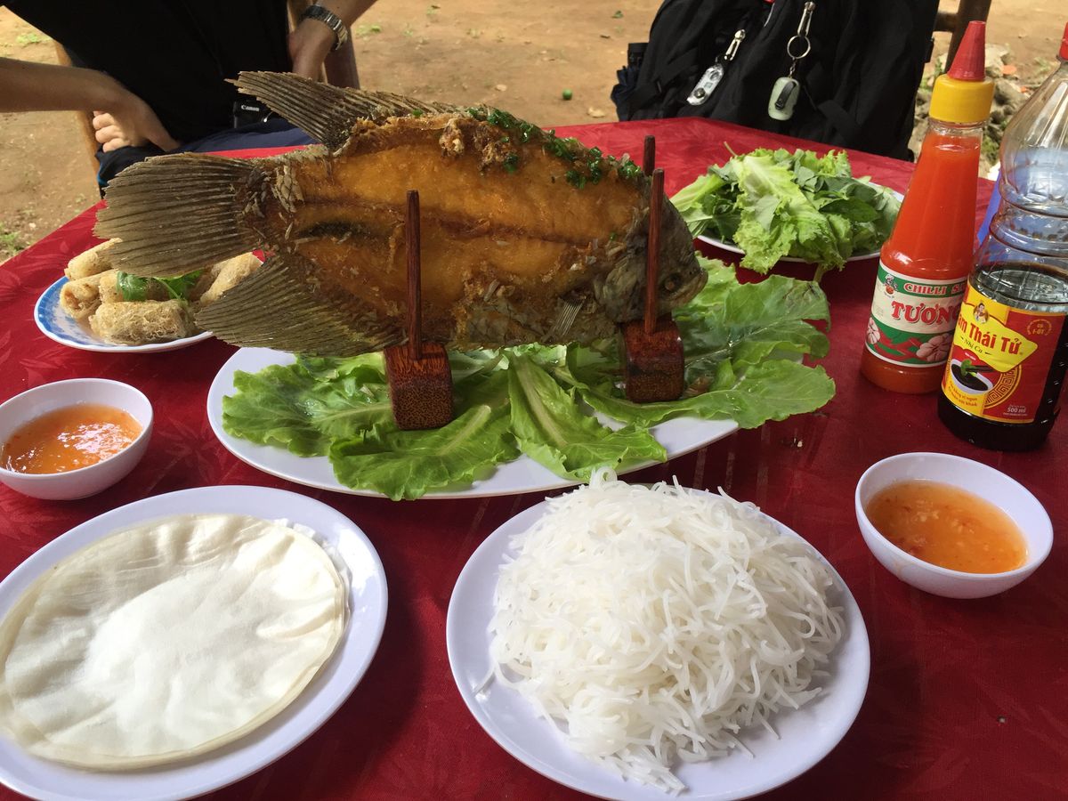 内容が盛りだくさんでした。ランチは、正直期待していなかったのですが、とても美味しくて食べきれないほどの量でした!象耳魚は身がふっくら柔らかくて生春巻きで食べたのが特に美味しかった。もっと生春巻きで食べたかったが、1人一個ずつ作ってくれた後は、野菜一切れと生春巻き数枚残っていたが、追加してもらえるのかわからず、魚だけでみんな食べていました。他に、ココナッツミルクのぜんざい、麺、揚げ春巻きなどが出てきました。メコン川クルーズも楽しくて良い体験でした。