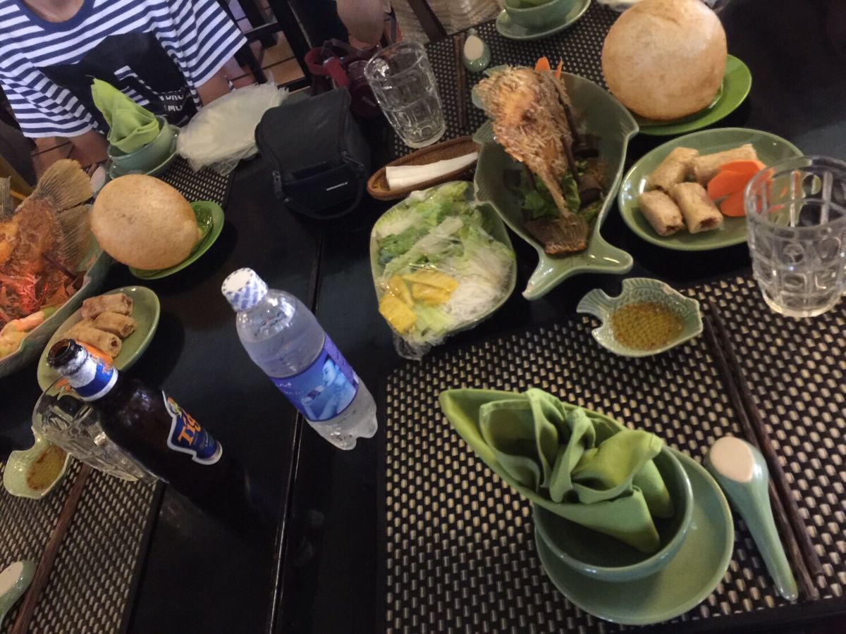 これだけ盛りだくさんで、食事もあるとやっぱり1人は浮きますね(笑)まぁ浮くのは気にしないんですが、メコン川の小舟や食事はグループごとが良かったです。小舟では、3人組の後ろに私で、写真を撮っている時は入ってしまわないか申し訳なかったし、3人の方も嫌な思いをしたかもしれません。食事は、大皿盛りが多く、4人で1セットみたいな感じだったので、1人や2人だと見知らぬ人とつつき合う感じで、遠慮しあっているように思いました。数のわかるものは良いけど、魚とか…グループごとか、1人ずつの配膳にしてほしい。